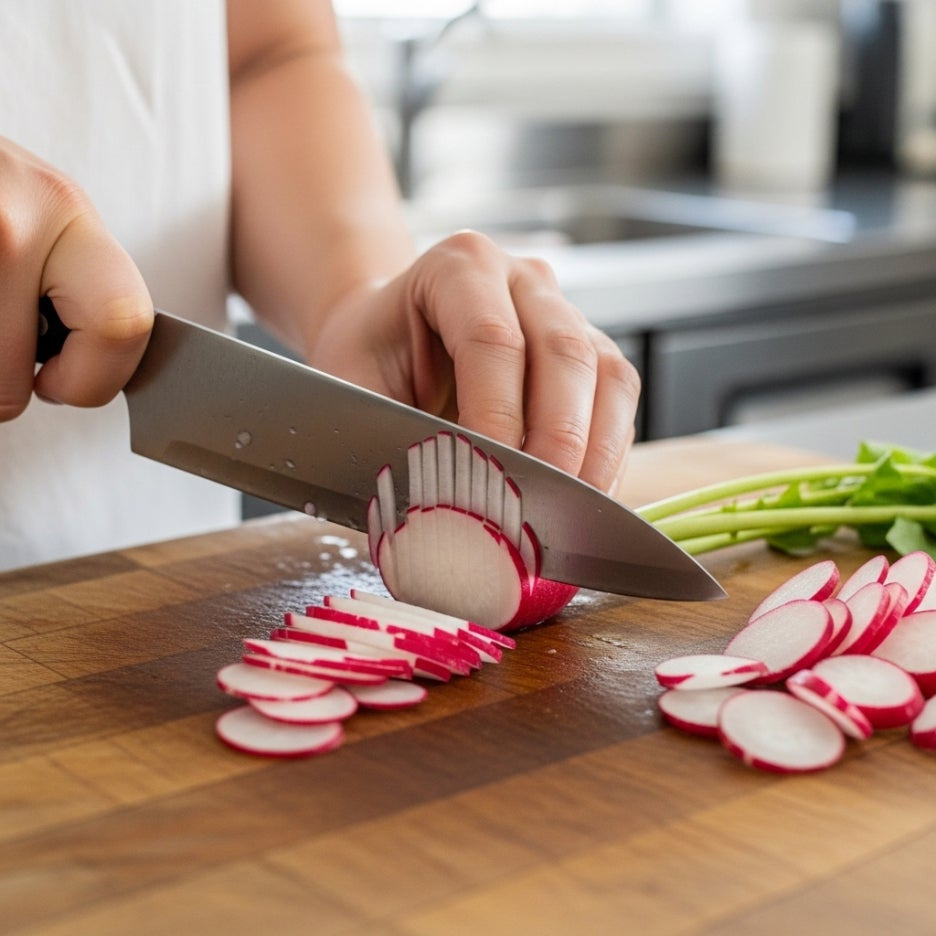 칼질이 서툴다면 채칼을 사용해도 좋지만, 직접 칼로 썰면 단면이 깔끔해 수분이 덜 빠져나온다는 장점이 있어요.