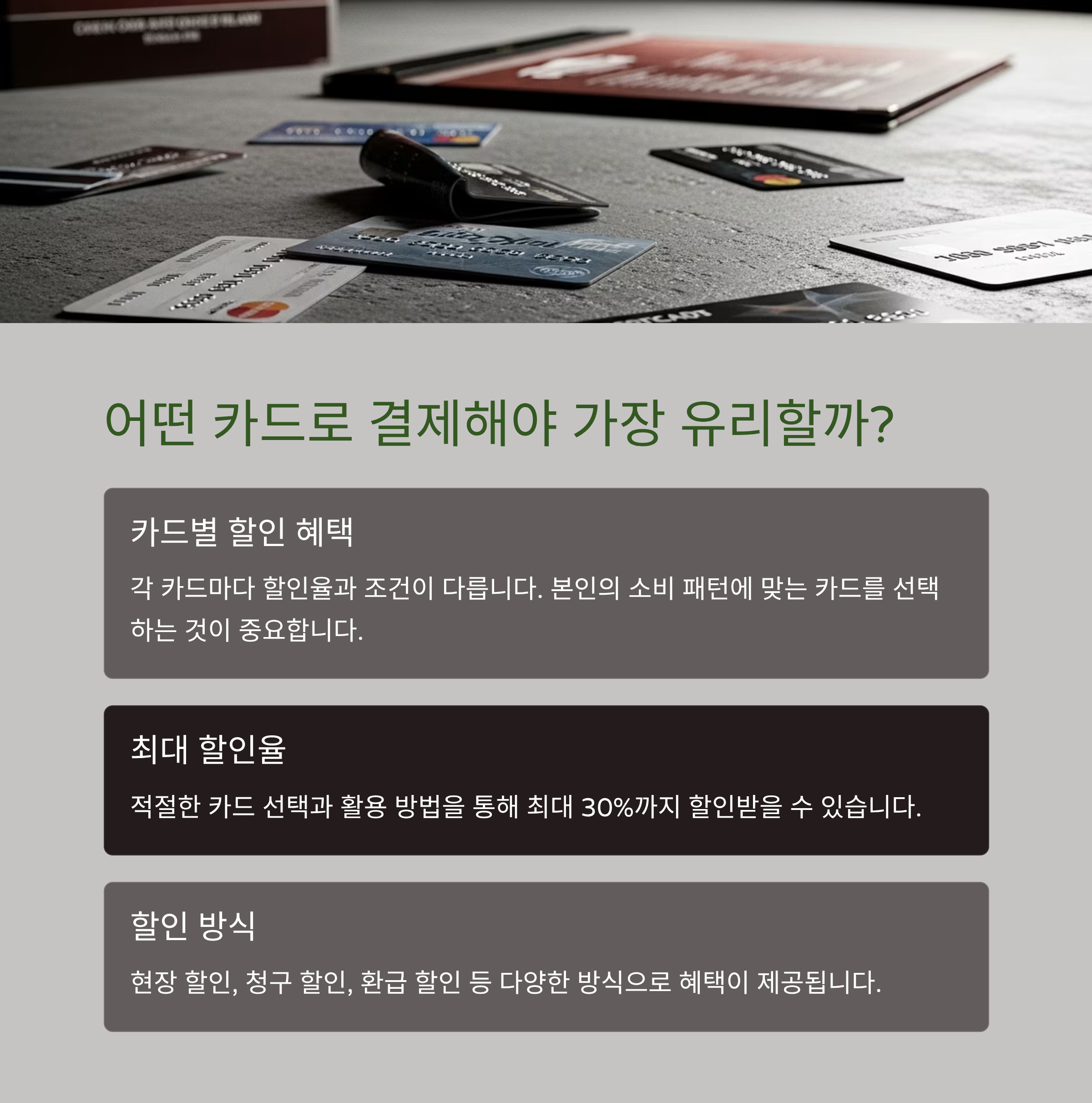 최대 30%까지 할인받을 수 있습니다. 주요 카드별 혜택과 활용 팁을 정리했습니다.