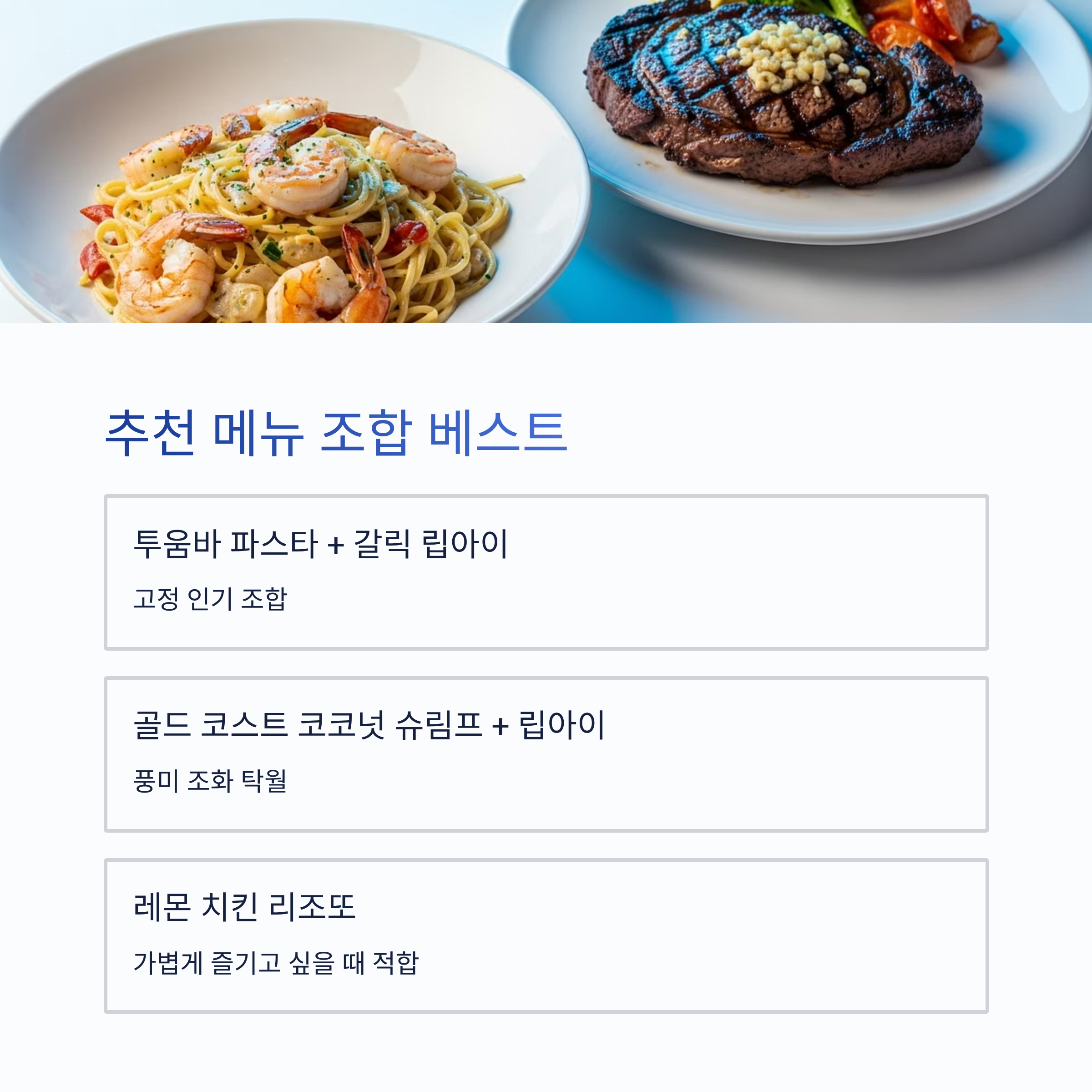 투움바 파스타 + 갈릭 립아이 : 고정 인기 조합