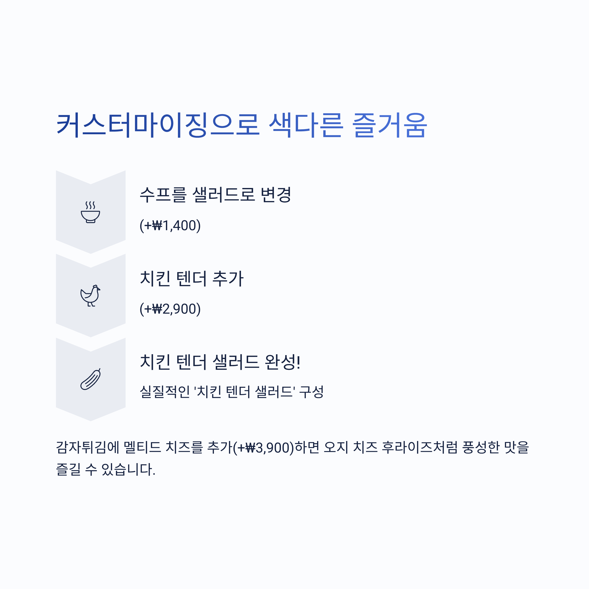 | 메뉴 커스터마이징 | 샐러드 변경, 감자 치즈 추가 등 만족도 상승 |