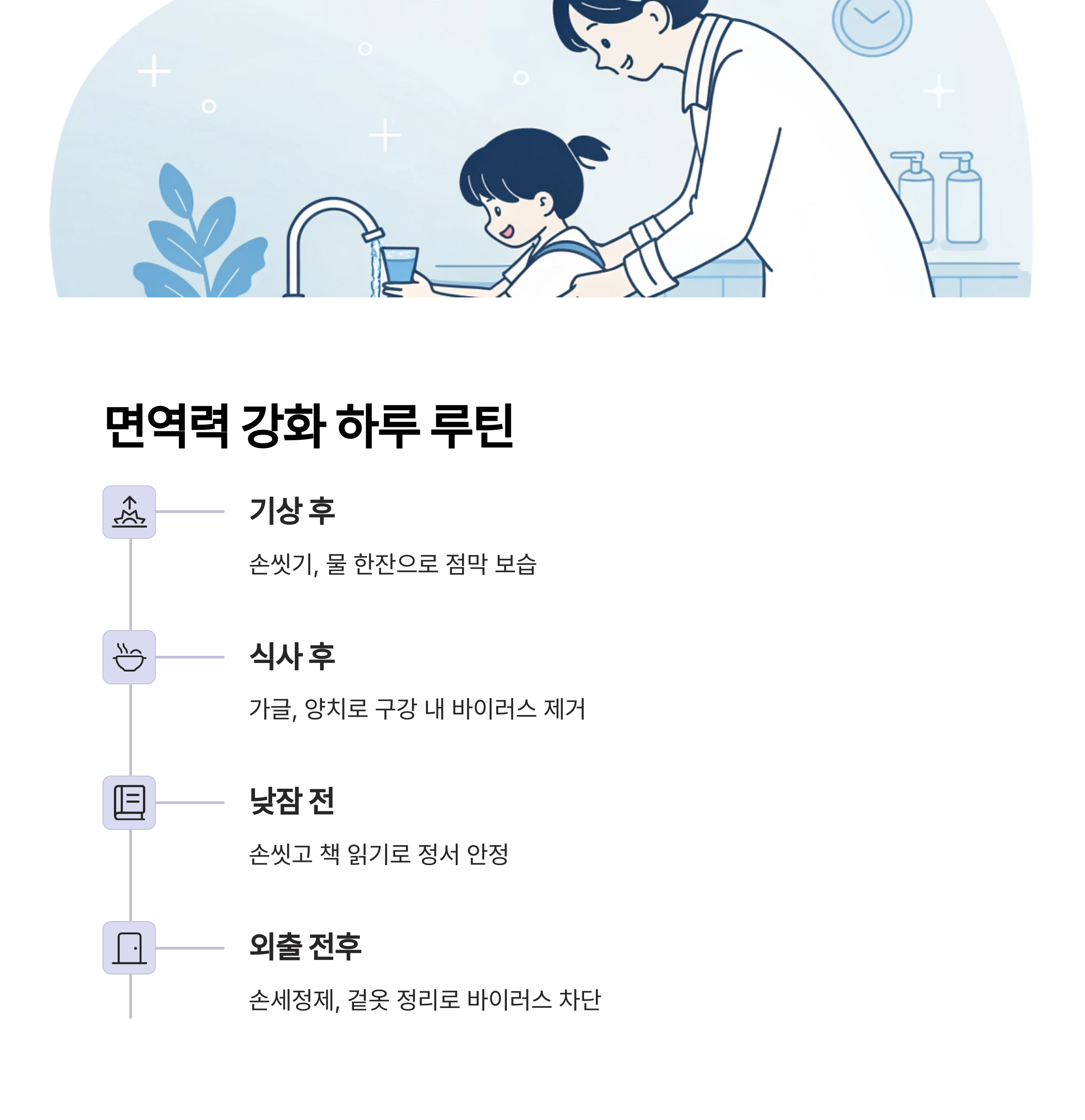 | 기상 후 | 손씻기, 물 한잔 | 점막 보습 & 수분 공급 |