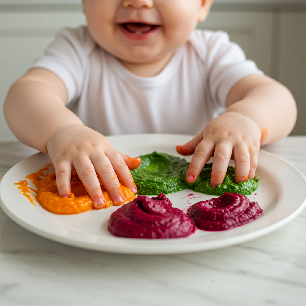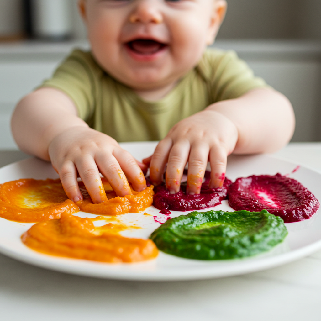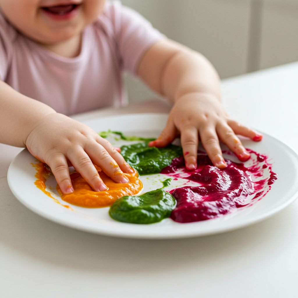 - '그림 그리기' 놀이: 쌀 미음 위에 빨간 비트 퓨레, 노란 단호박 퓨레, 초록 시금치 퓨레를 얹어주세요. 숟가락으로 재료들을 휘저어보며 아이와 함께 그림을 그리는 것처럼 놀아보세요. "우와~ 빨간색이네?", "초록색이 예쁘다!" 같은 긍정적인 말을 계속 건네는 것도 중요해요.