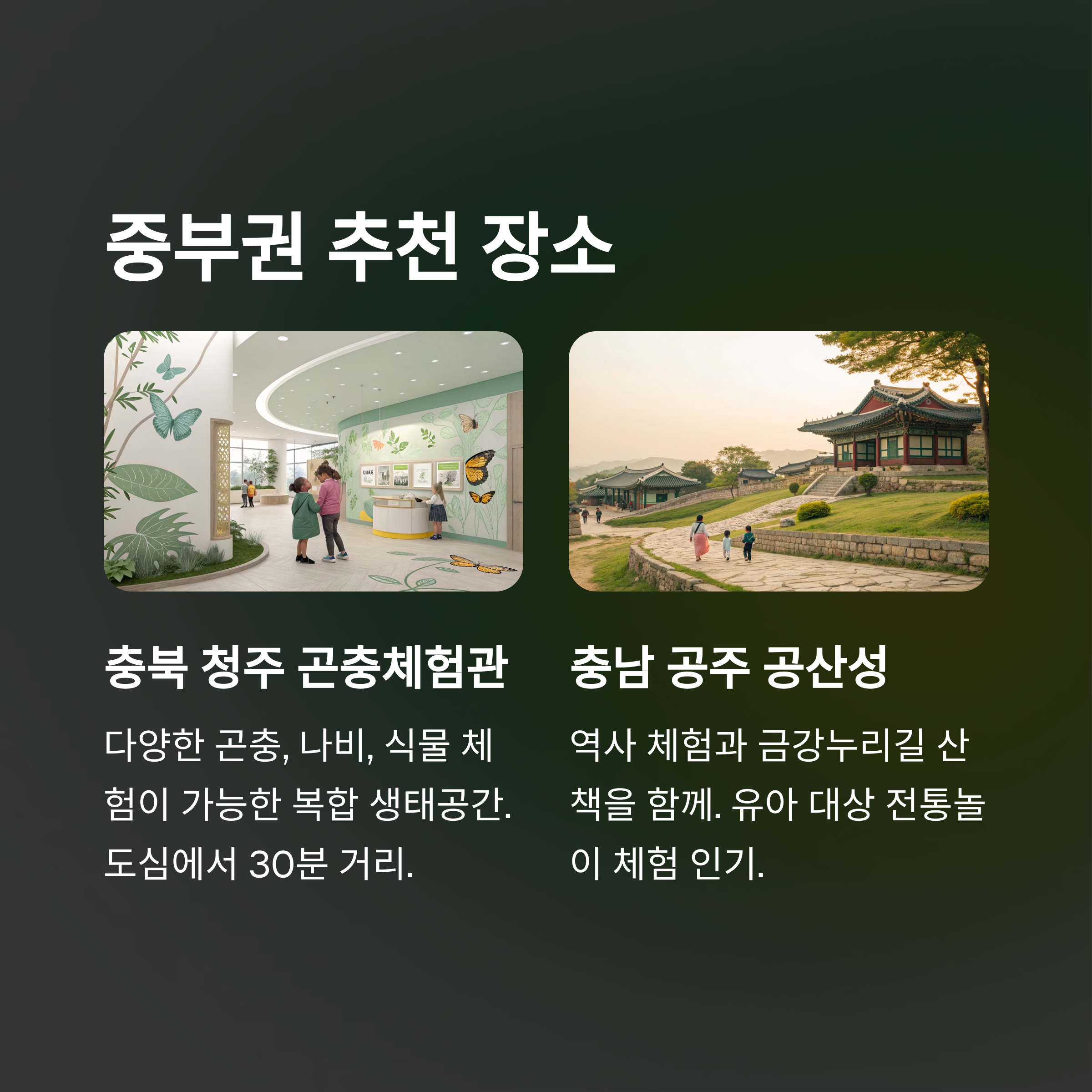 | 충북 | 청주 곤충체험관 | 곤충 관찰 + 실내 체험 | 유아~초등 |