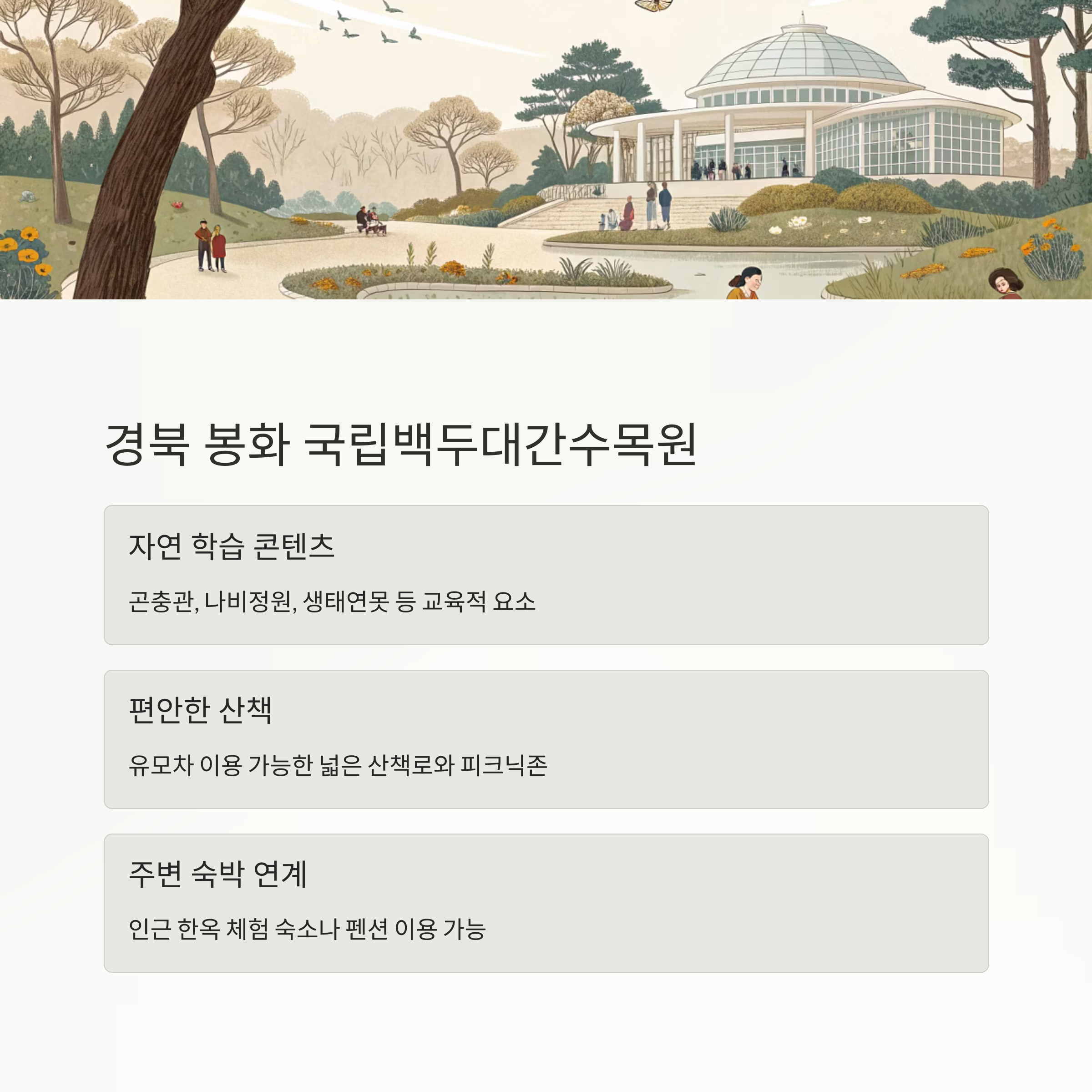 | 경북 봉화 | 백두대간 수목원 | 자연학습 + 산책 + 피크닉 | 전 연령대 |