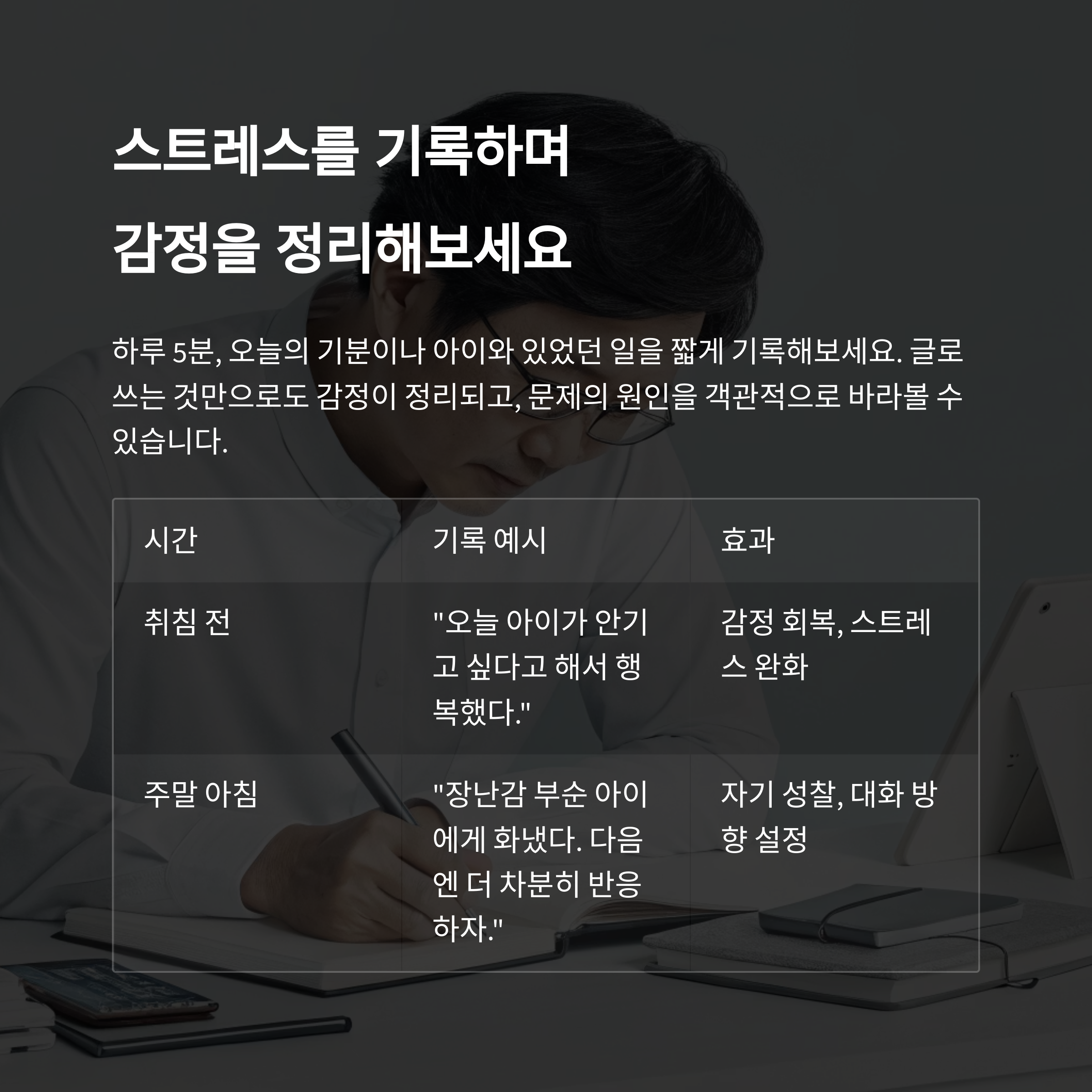 | 주말 아침 | “장난감 부순 아이에게 화냈다. 다음엔 더 차분히 반응하자.” | 자기 성찰, 대화 방향 설정 |