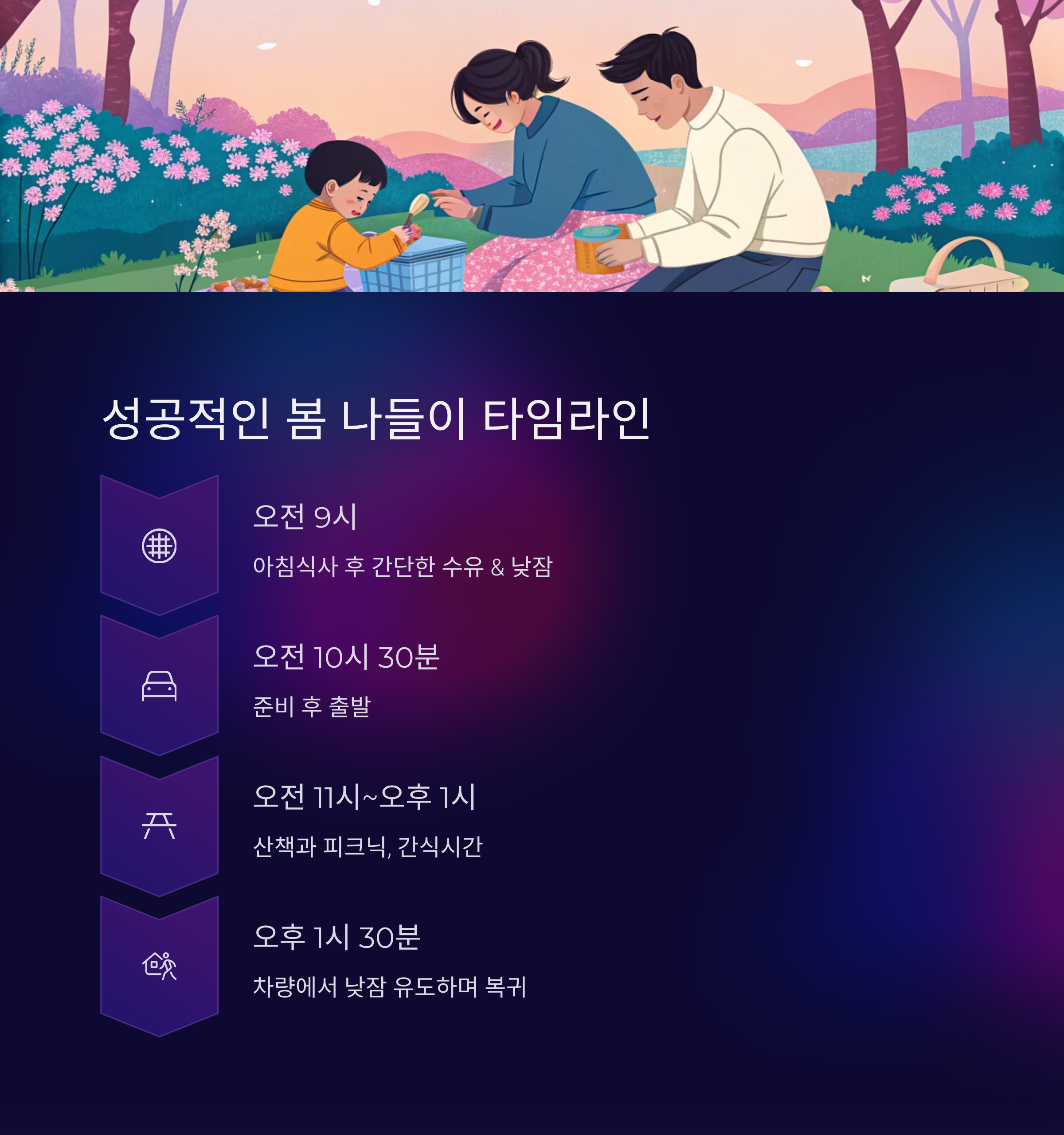 "봄날의 가족 나들이"를 예시로 구성해 봤어요.