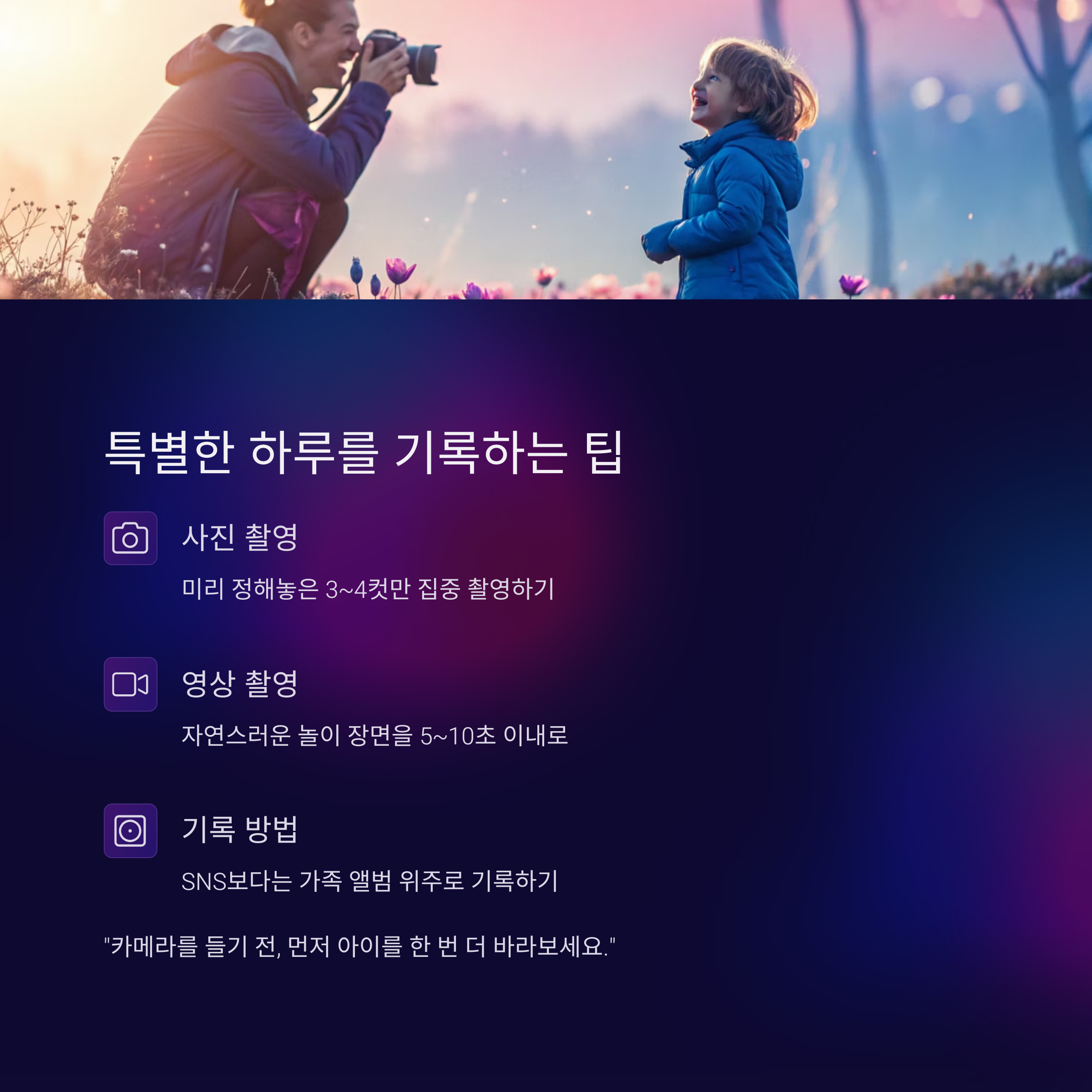 "카메라를 들기 전, 먼저 아이를 한 번 더 바라보세요."