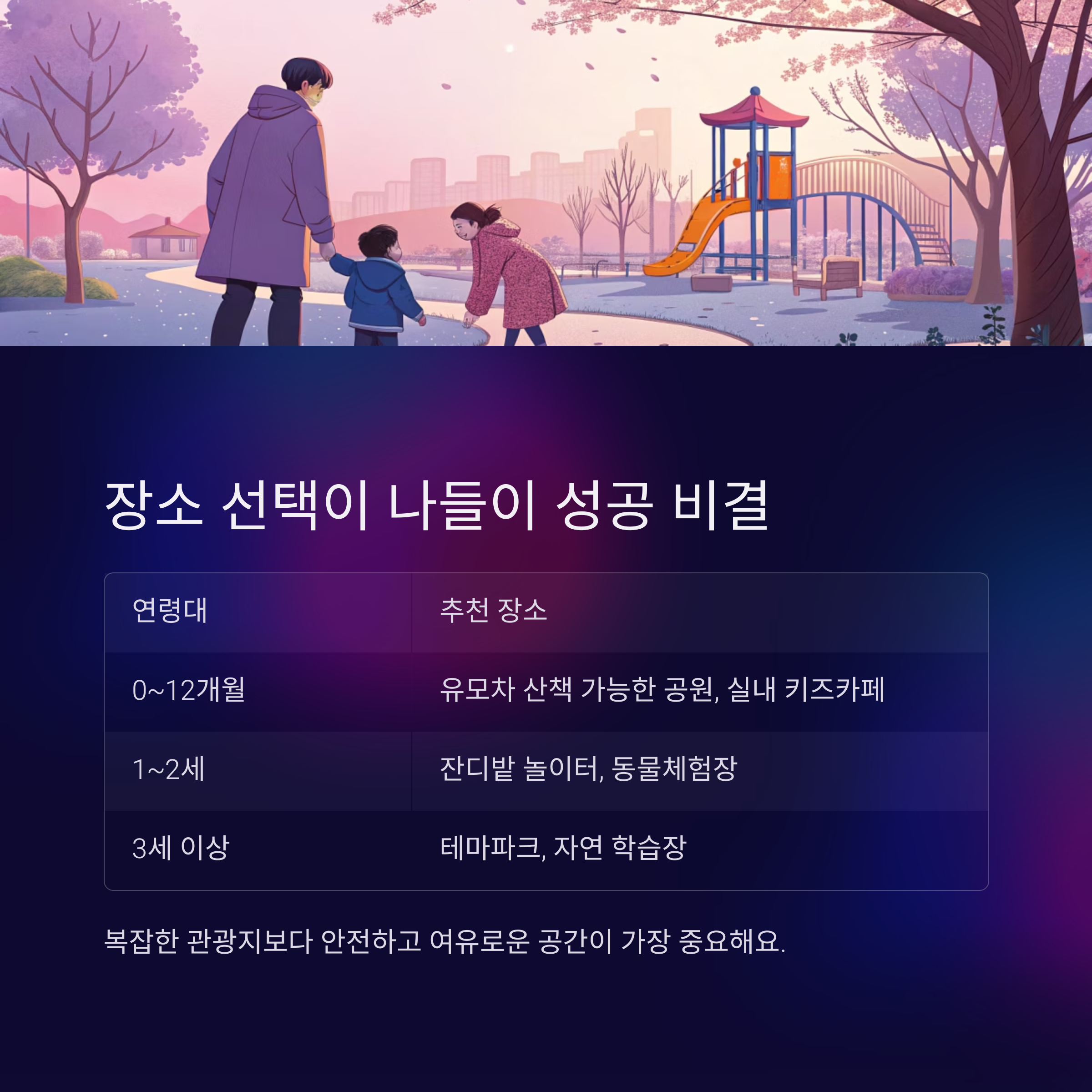 | 0~12개월 | 유모차 산책 가능한 공원, 실내 키즈카페 |