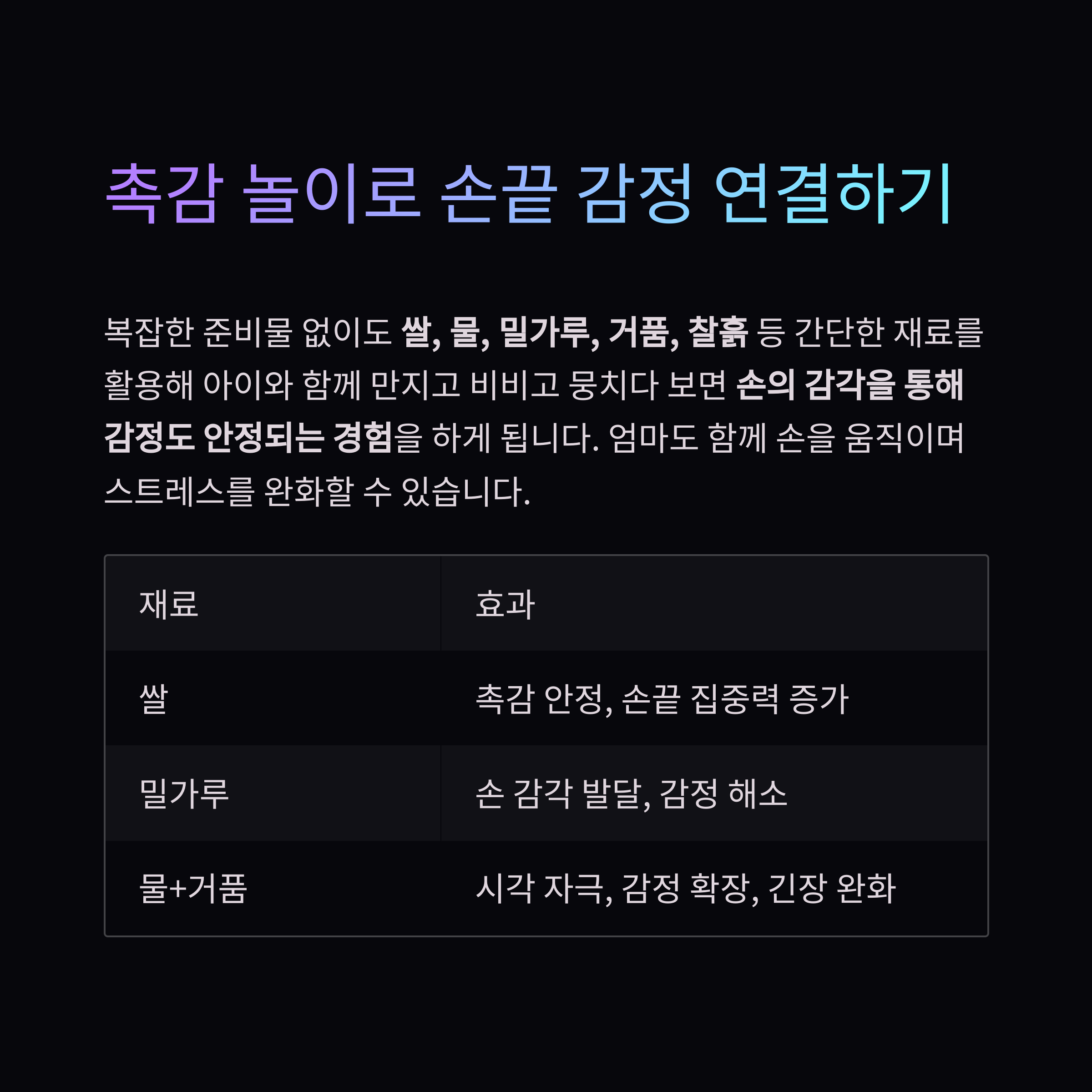 | 밀가루 | 손 감각 발달, 감정 해소 |