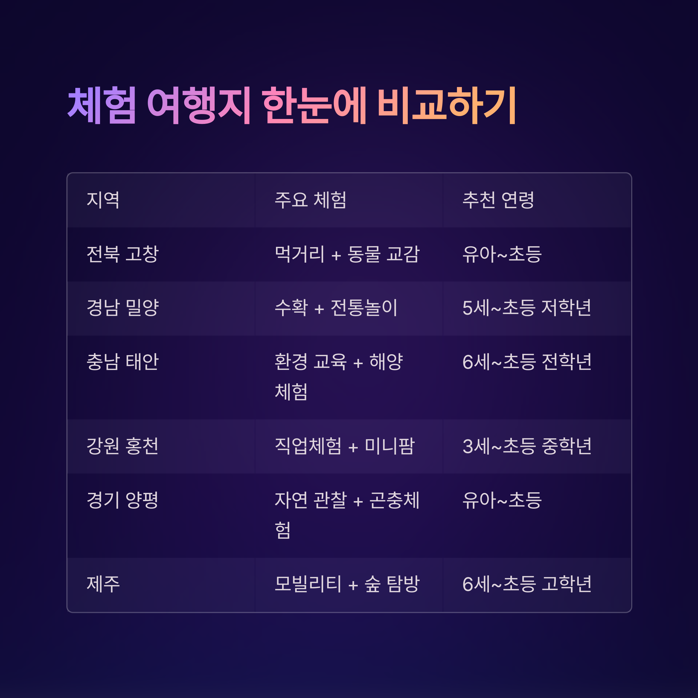 체험 여행지 비교 요약표