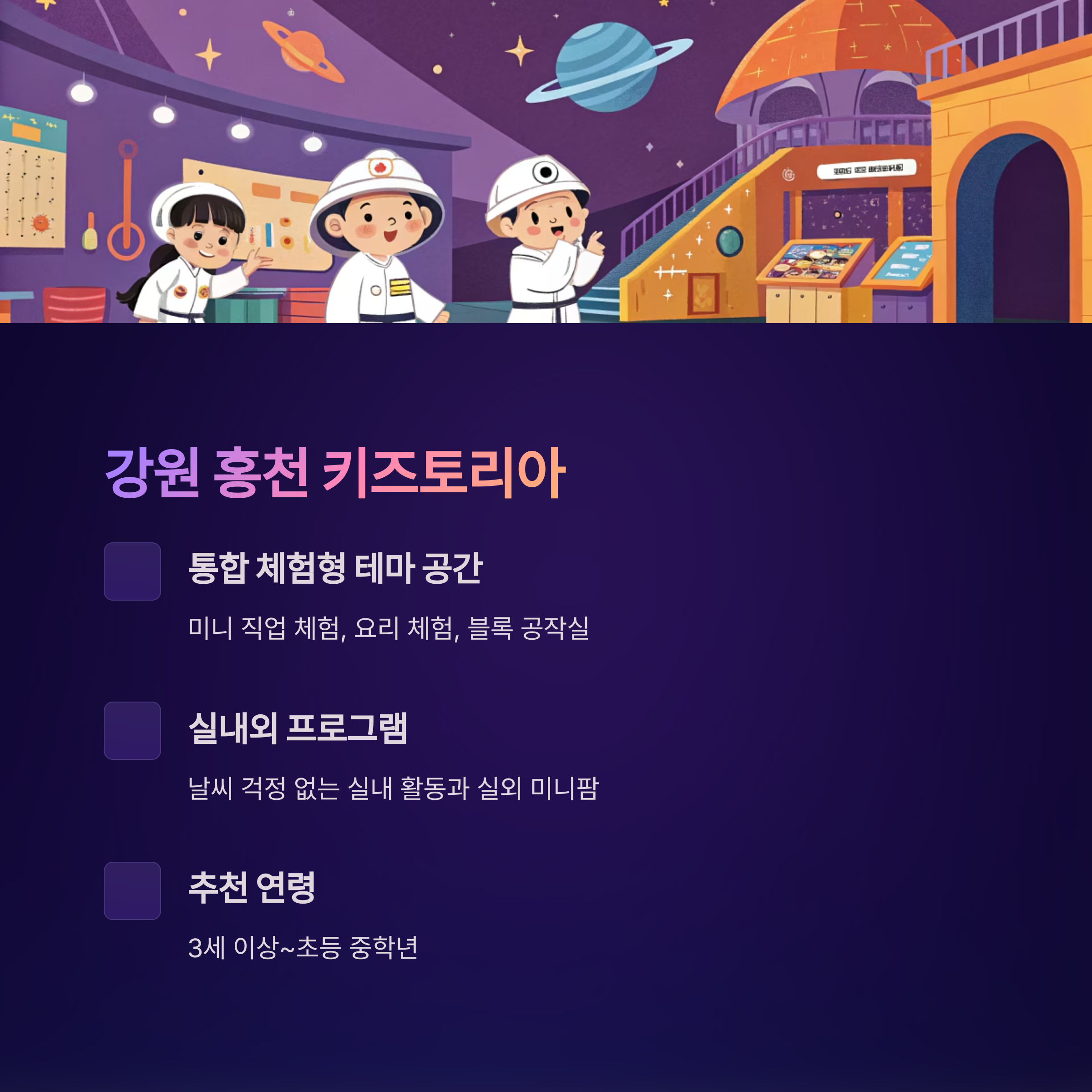 | 강원 홍천 | 키즈토리아 | 실내 직업체험 + 야외 미니팜 | 3세~초등 중학년 |