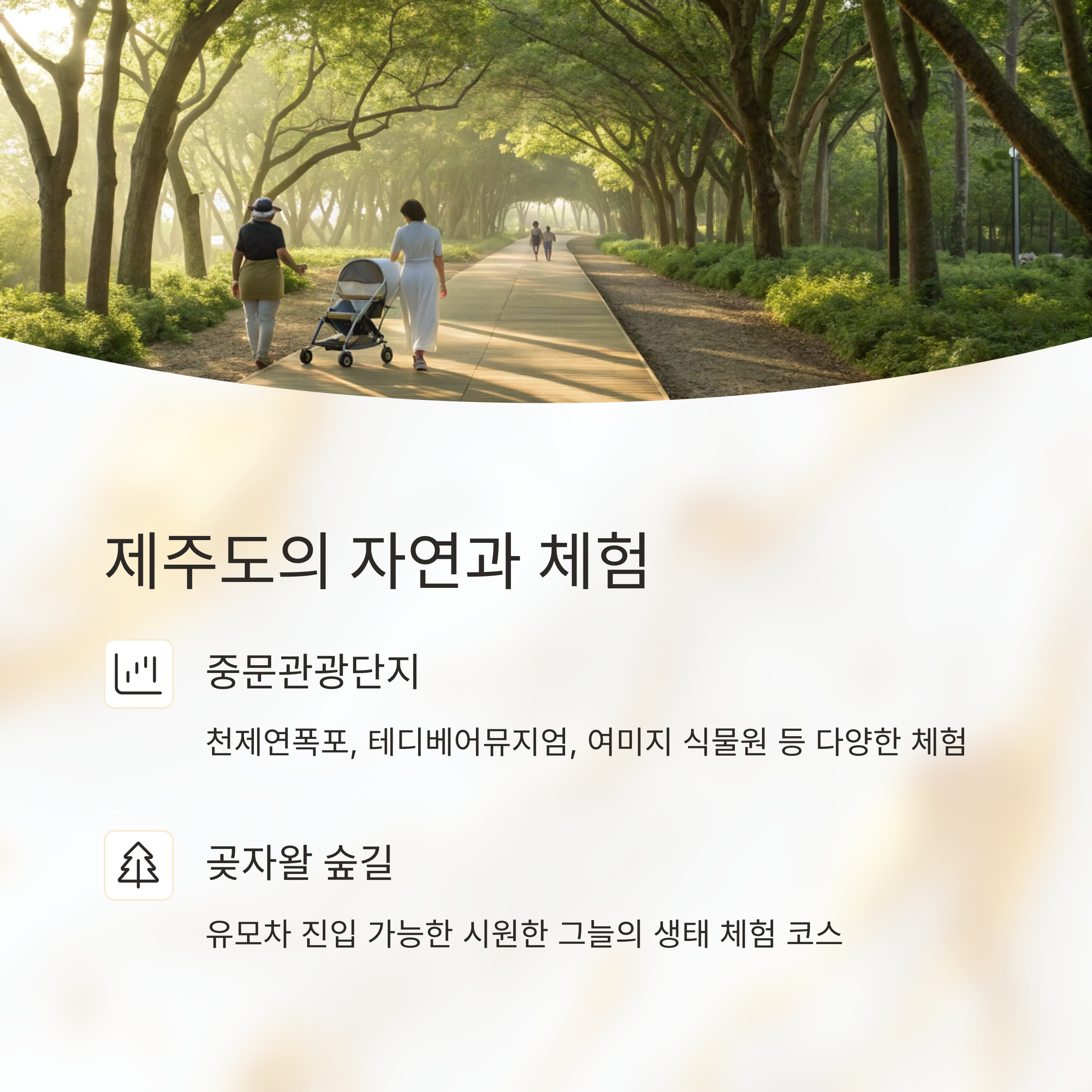 | 제주 | 중문단지 & 곶자왈 숲 | 실내 체험 + 숲 산책 | 유아~초등 |