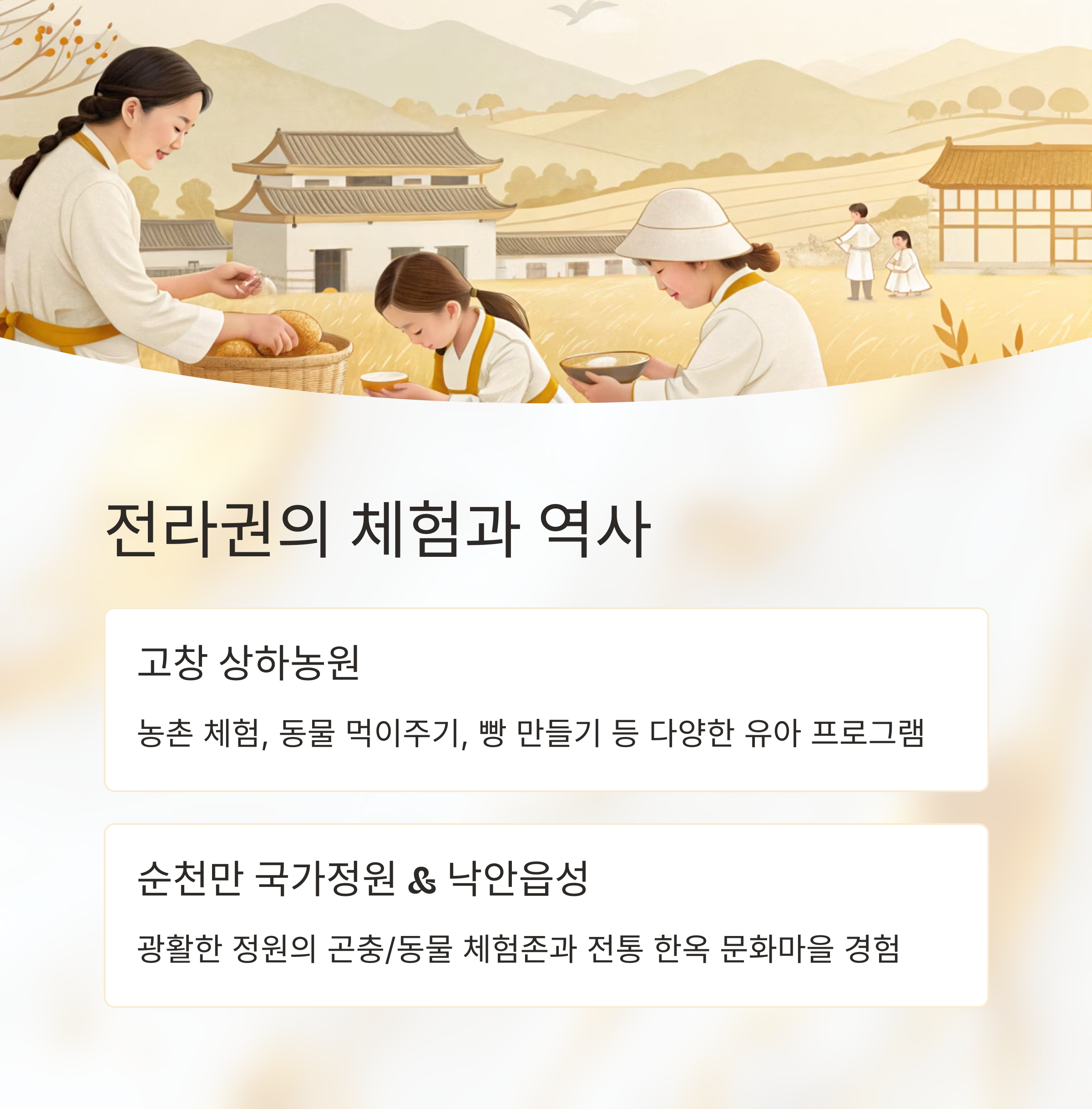 | 전남 | 순천정원 & 낙안읍성 | 생태 체험 + 전통 문화 | 유아~초등 |