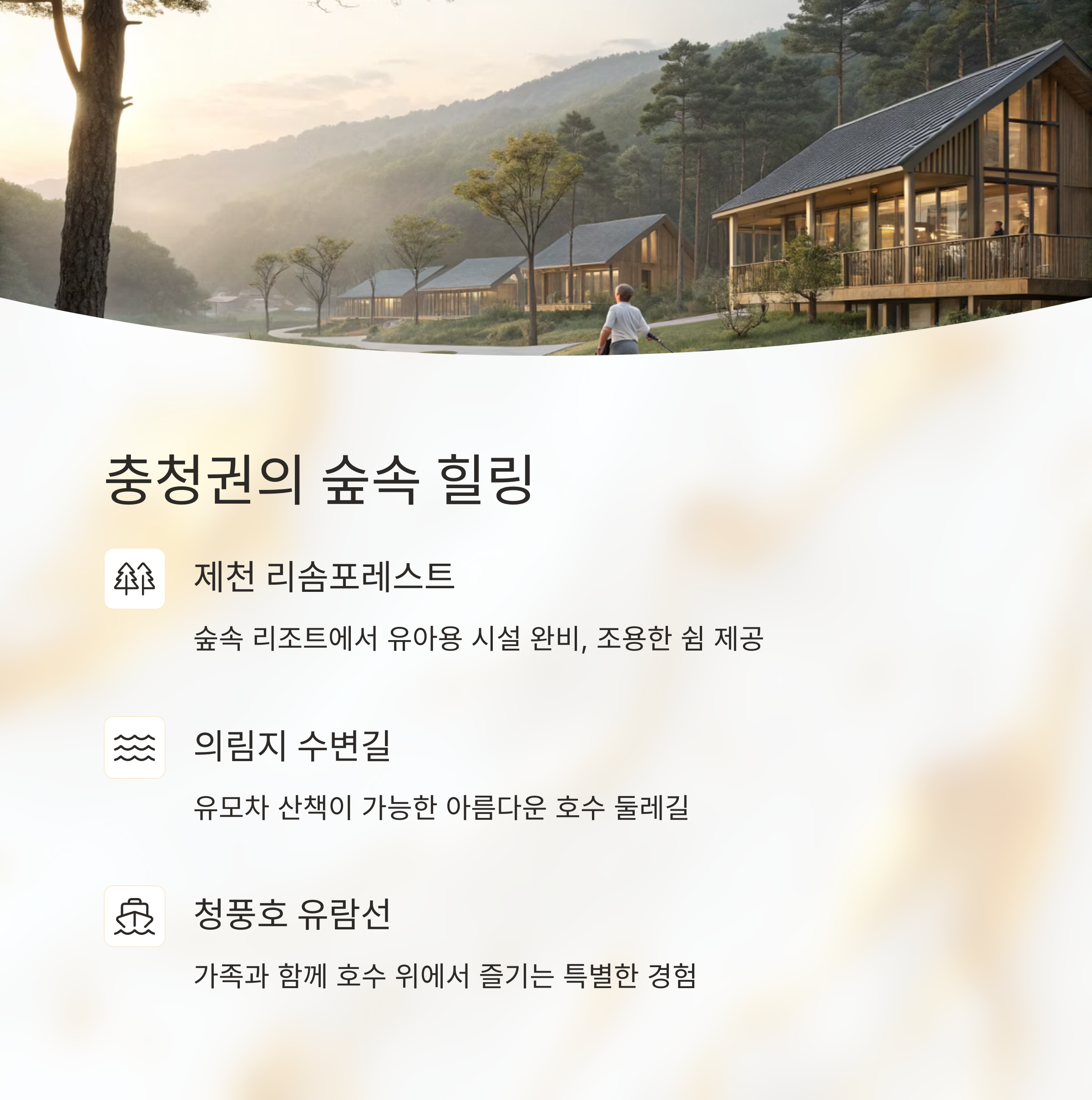 | 충북 | 리솜포레스트 & 의림지 | 숲속 숙소 + 유모차 산책로 | 유아 중심 |