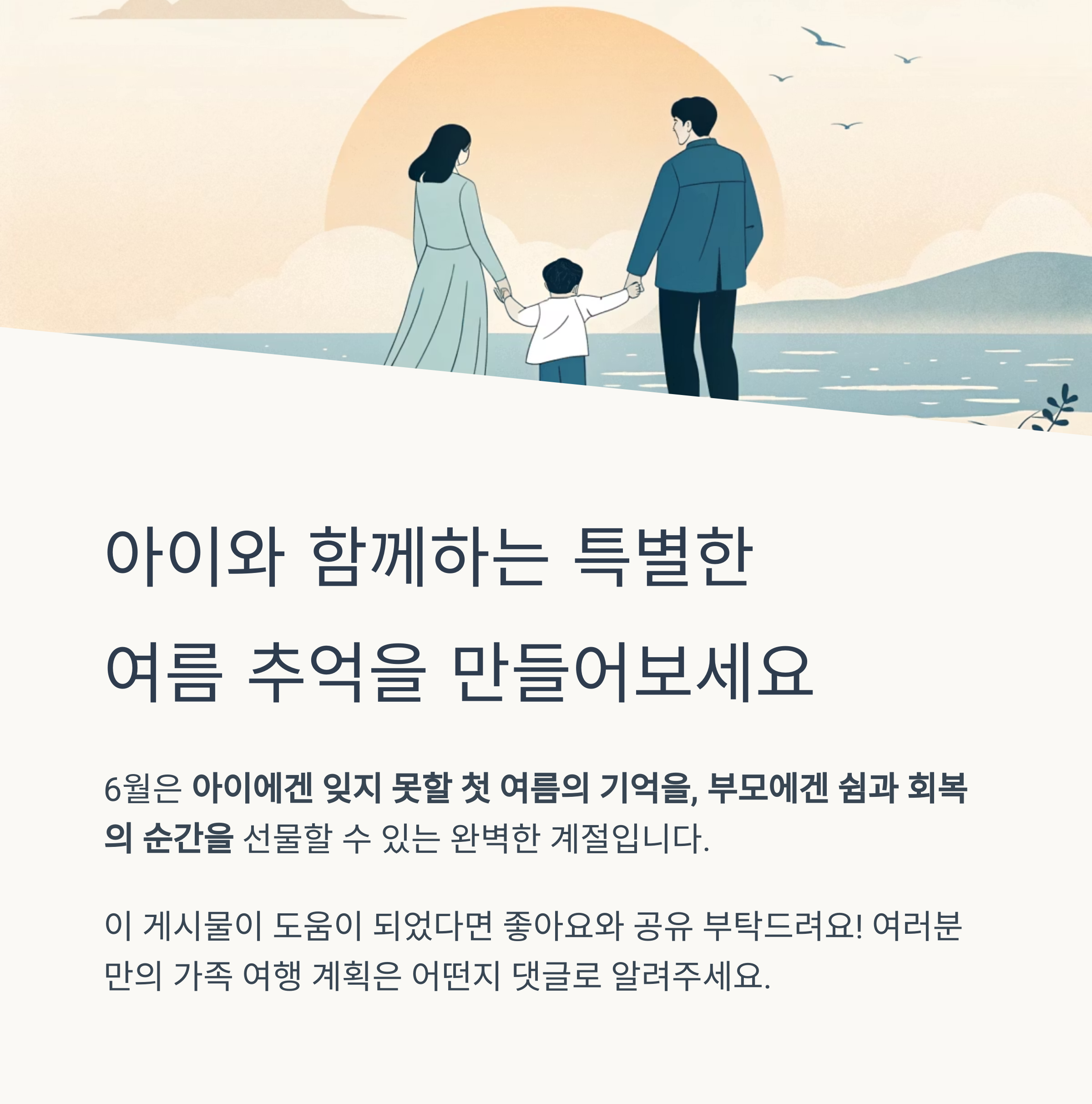 아이에겐 잊지 못할 첫 여름의 기억을, 부모에겐 쉼과 회복의 순간을 선물할 수 있습니다
