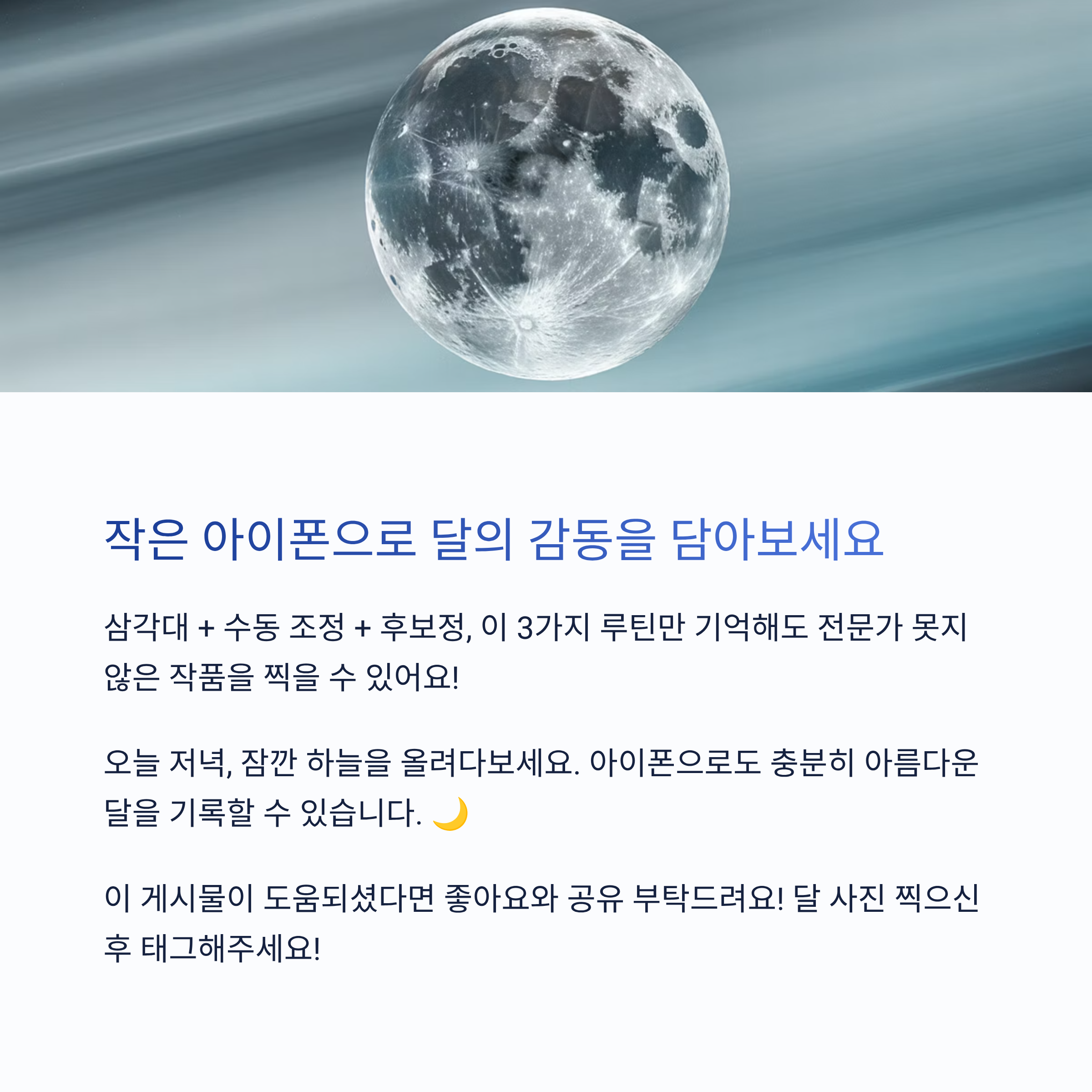 하지만 몇 가지 팁만 기억하면 누구나 선명하고 감성적인 달 사진을 찍을 수 있답니다!