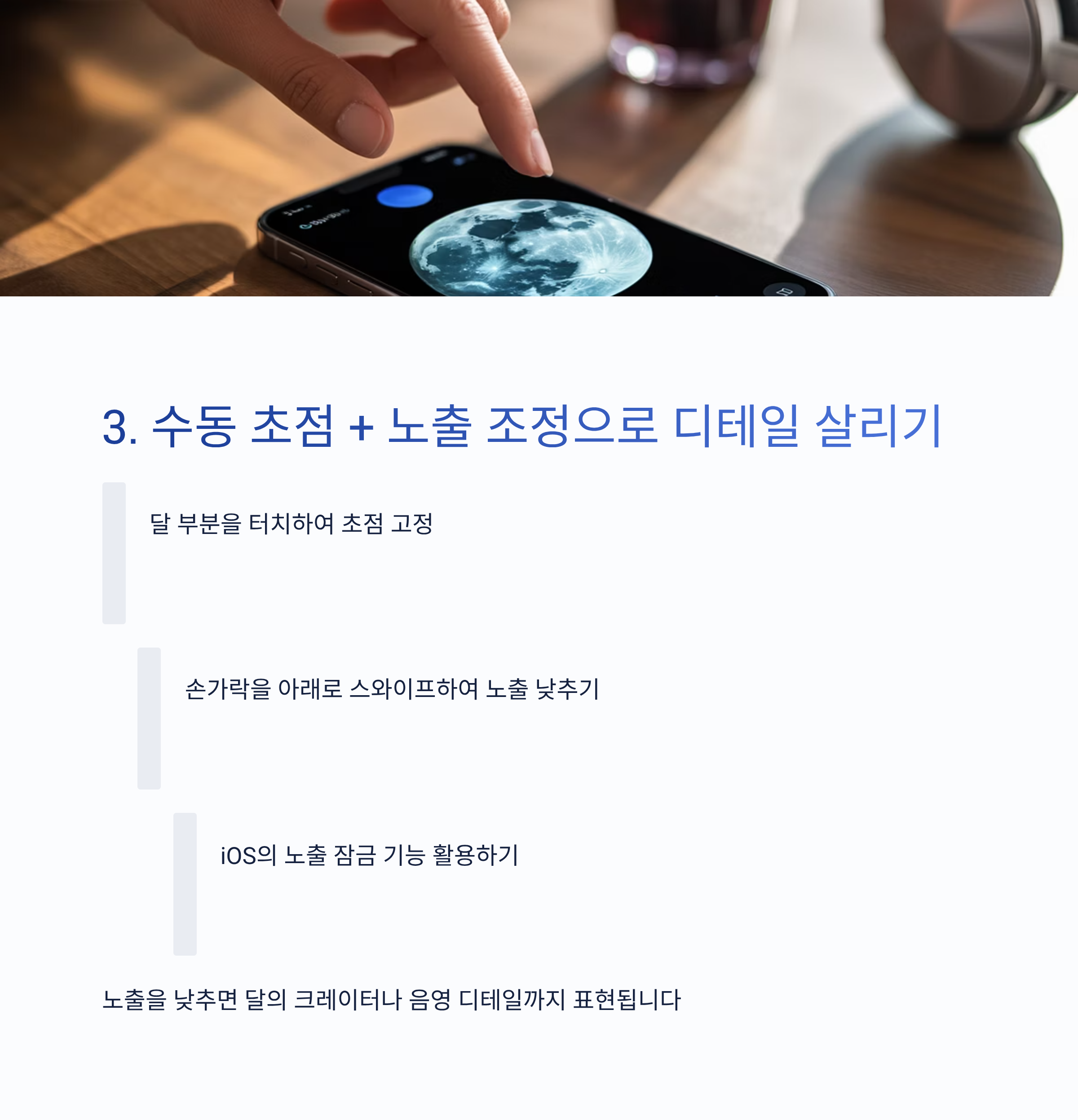 🌙 3. 수동 초점 + 노출 조정으로 디테일 살리기