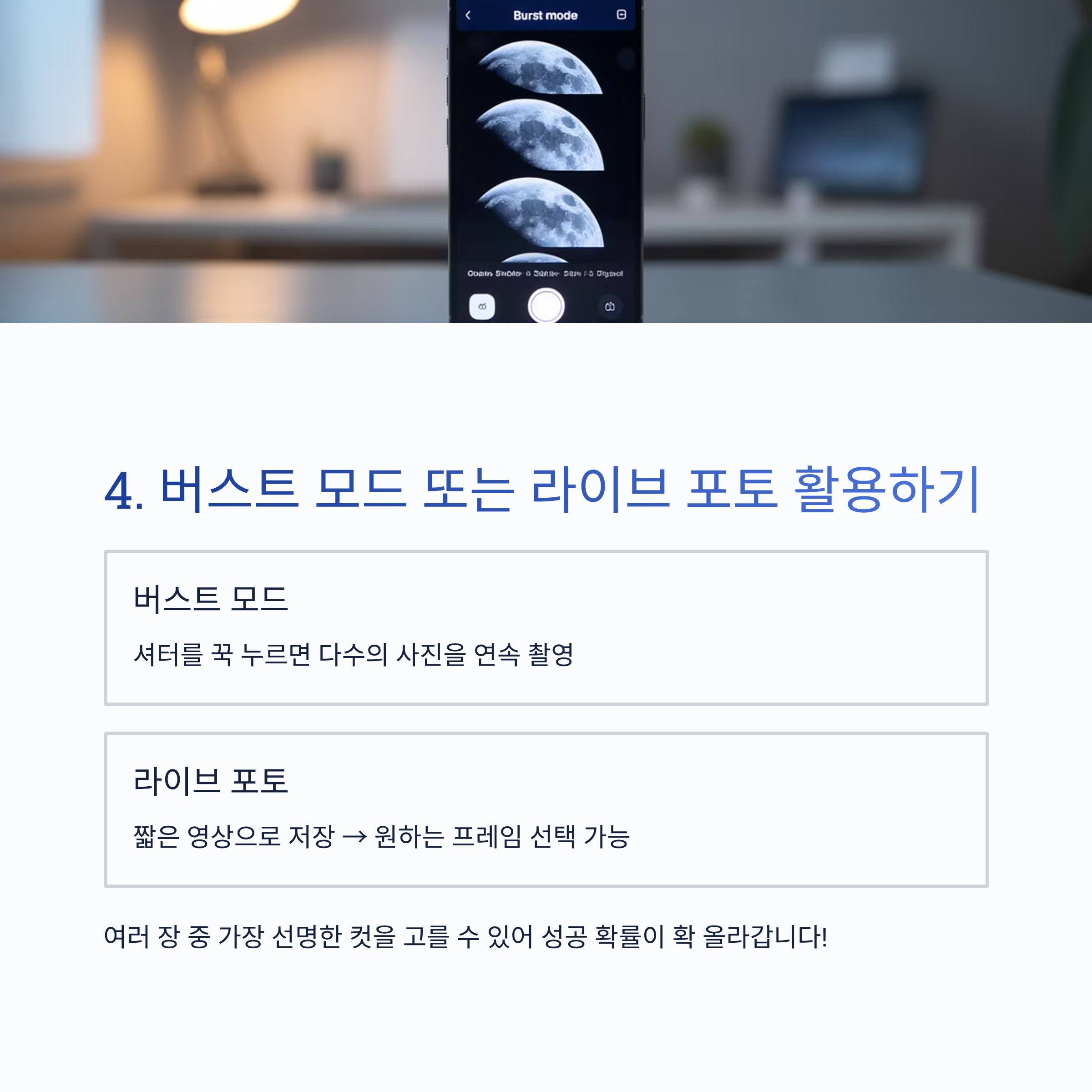 📷 4. 버스트 모드 또는 라이브 포토 활용하기