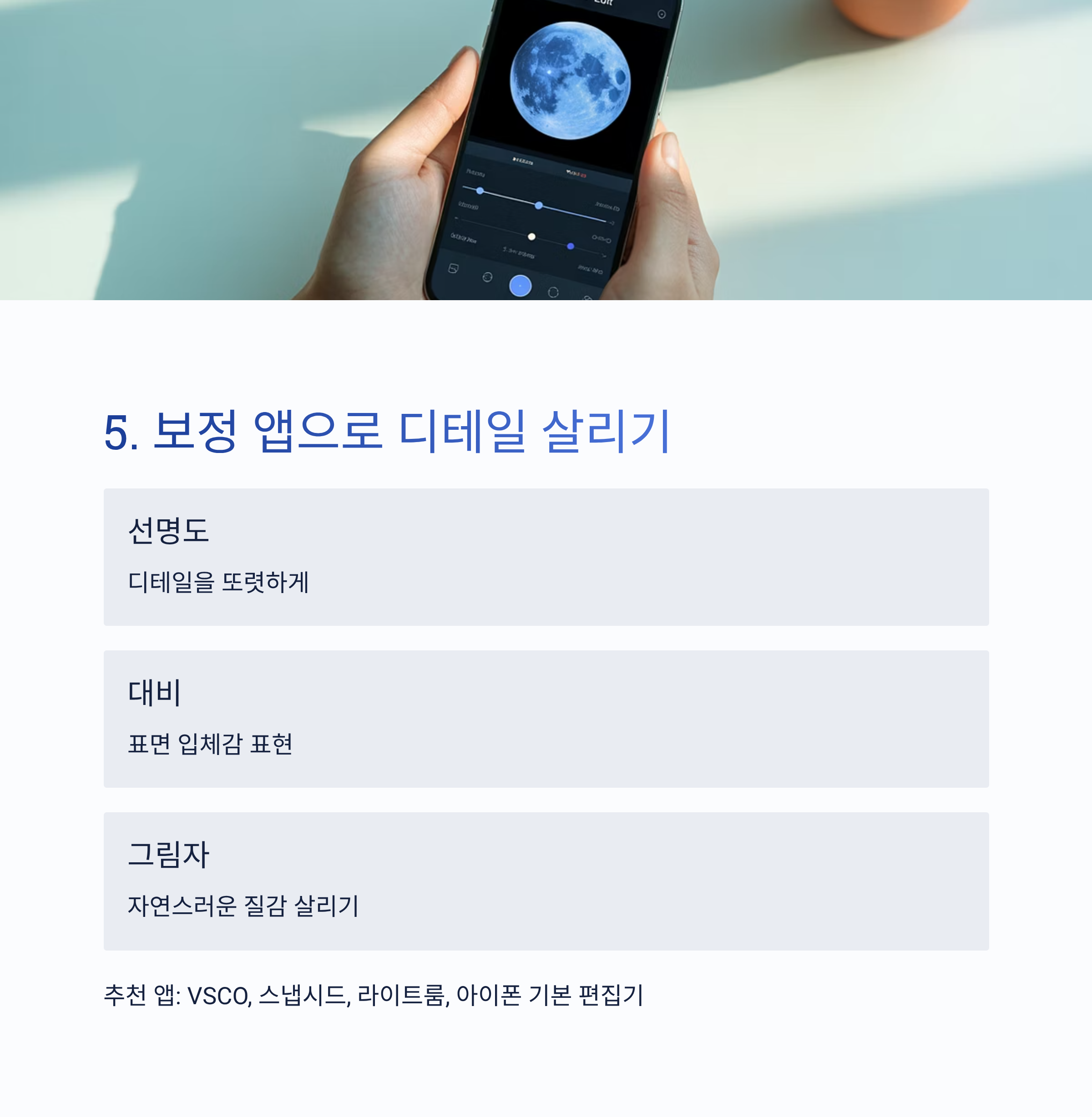 - 추천 앱: VSCO, 스냅시드, 라이트룸, 아이폰 기본 편집기