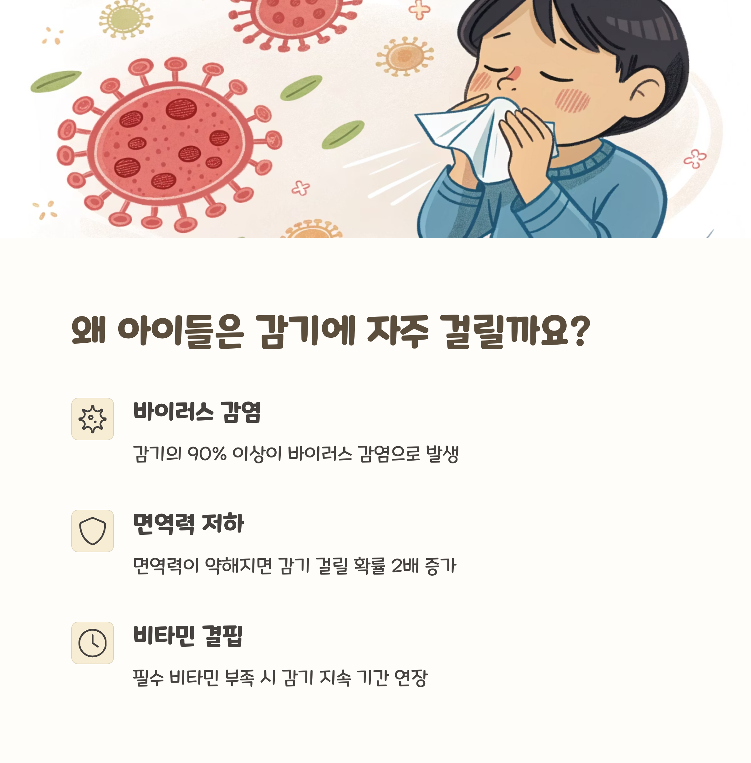 "비타민은 면역력을 튼튼하게 만들어 감기 바이러스에 맞서는 방패 역할을 합니다."