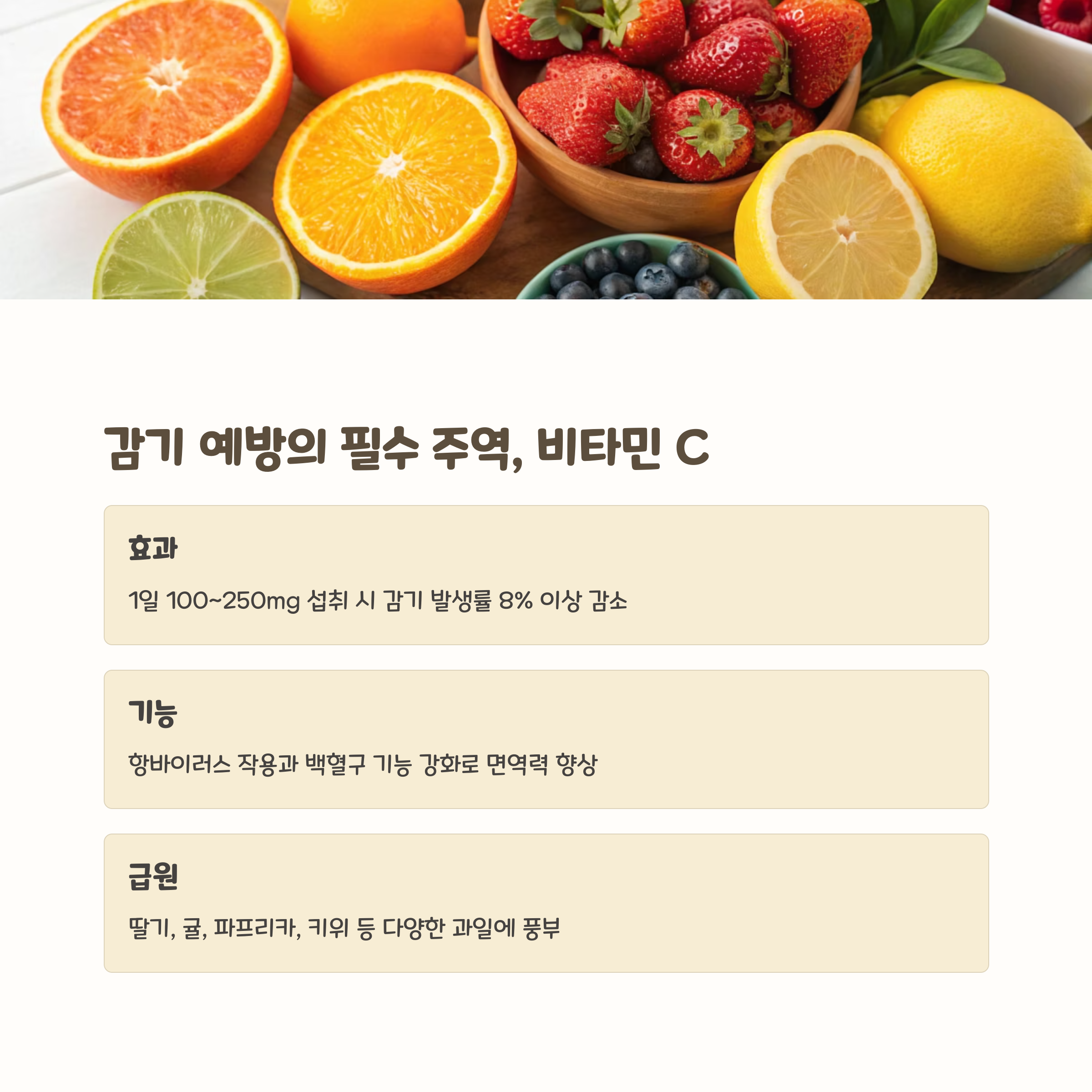 - 비타민 C: 면역 세포 기능 강화, 바이러스 억제