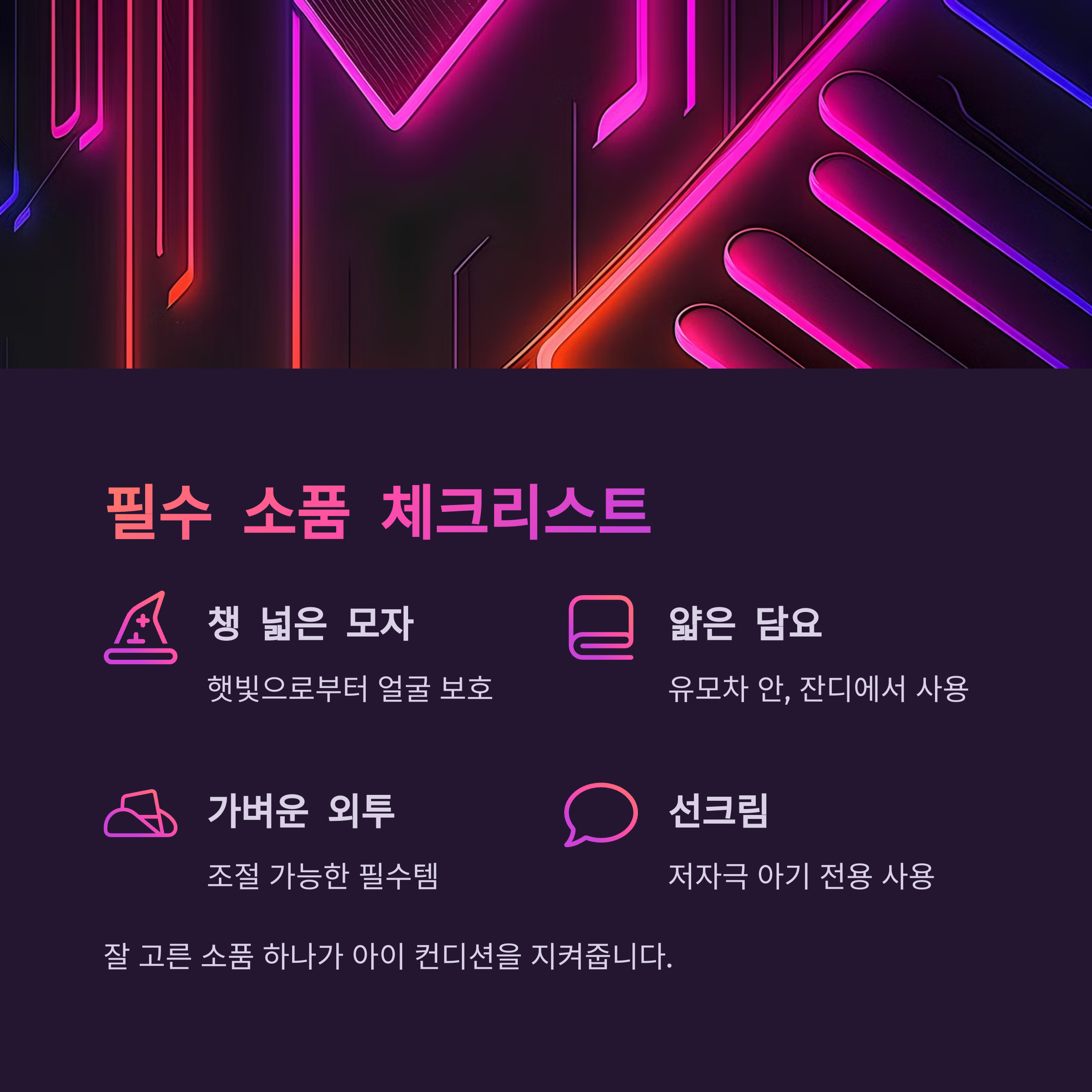 | 21~24도 | 반팔 + 얇은 가디건 or 긴팔 셔츠 | 햇볕 대비 모자 필수 |