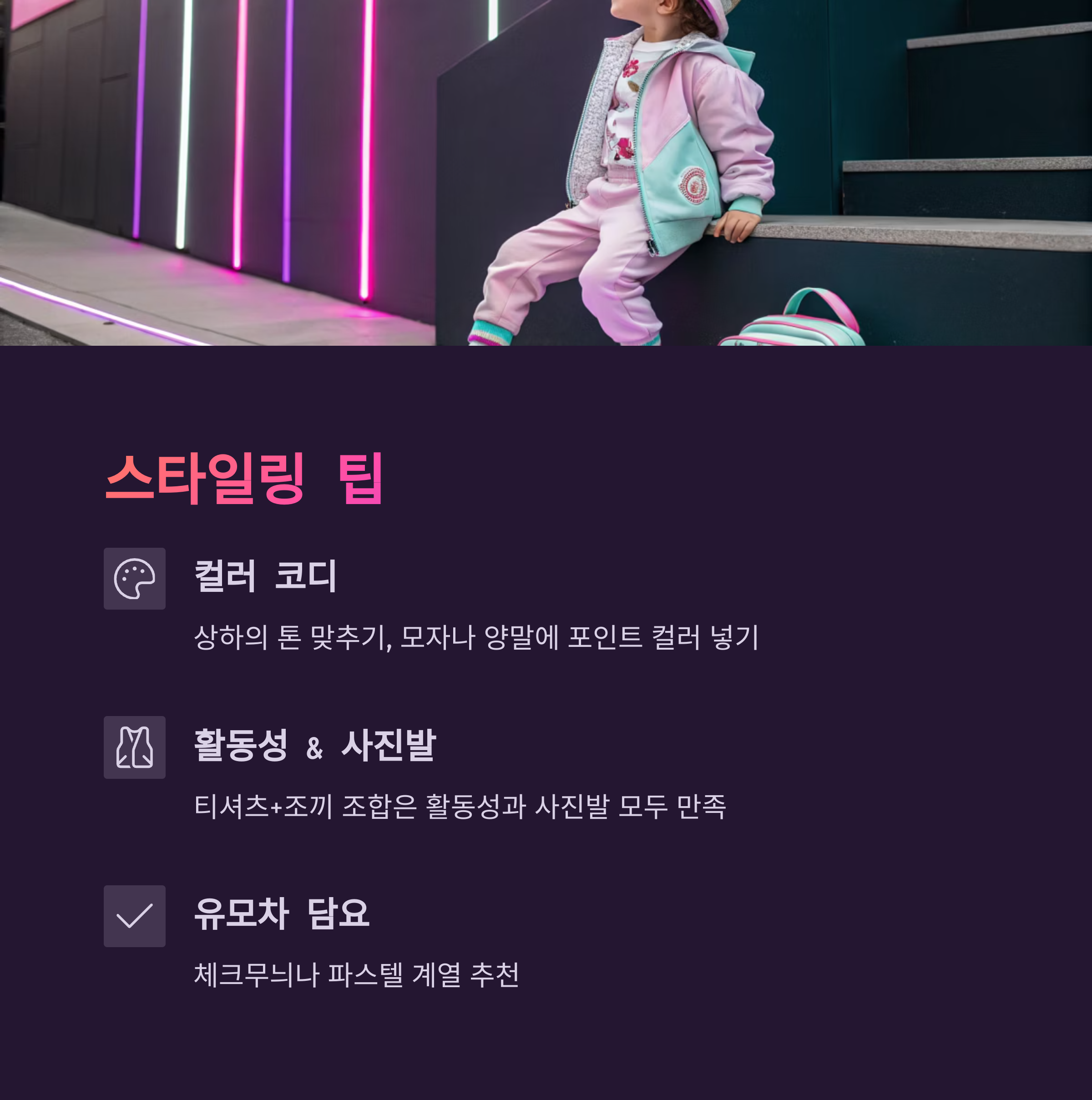 - 상하의 컬러 톤 맞추면 귀여움 ↑
