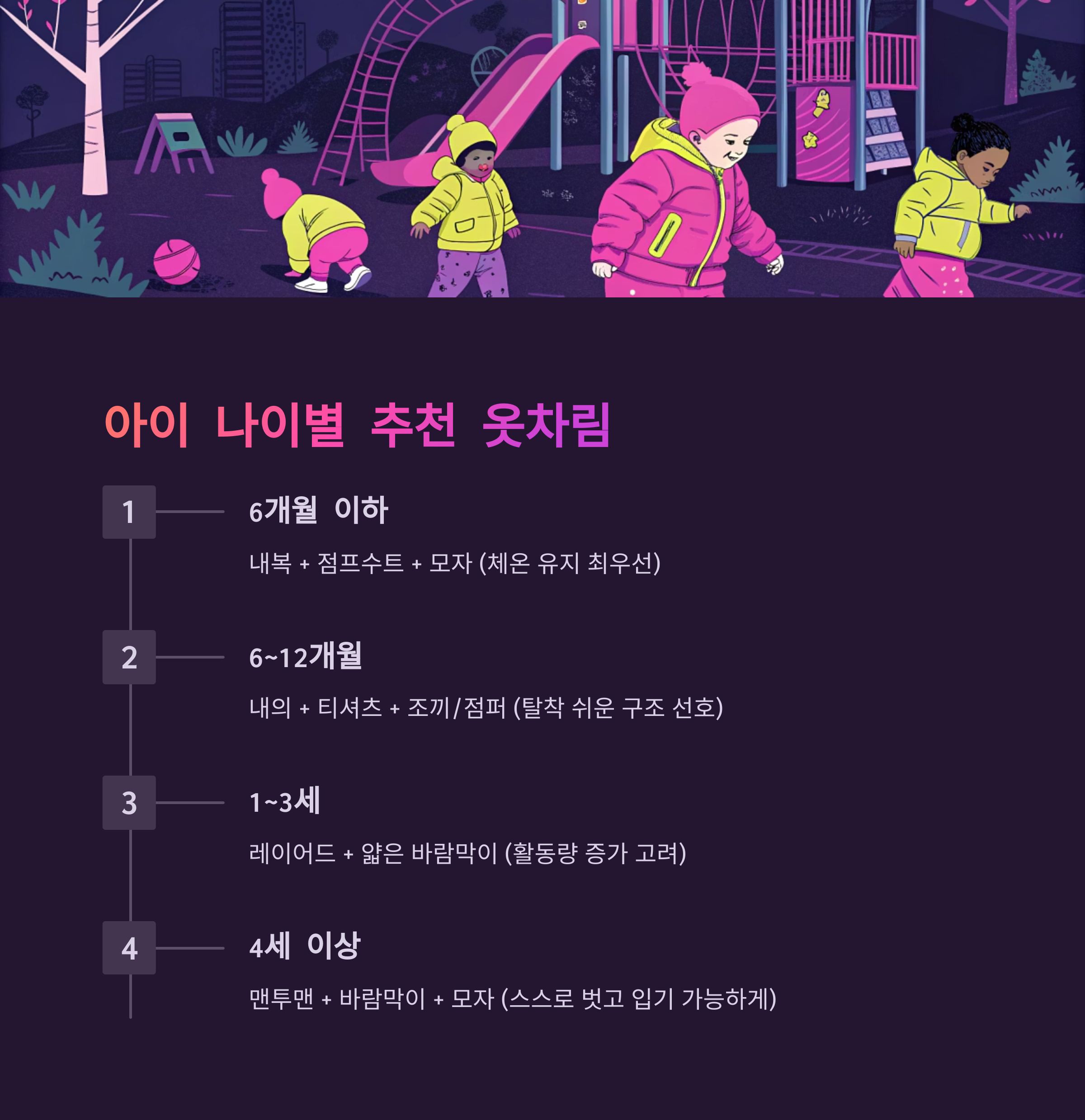 | 4세 이상 | 맨투맨 + 바람막이 + 모자 | 스스로 벗고 입기 가능하게 |
