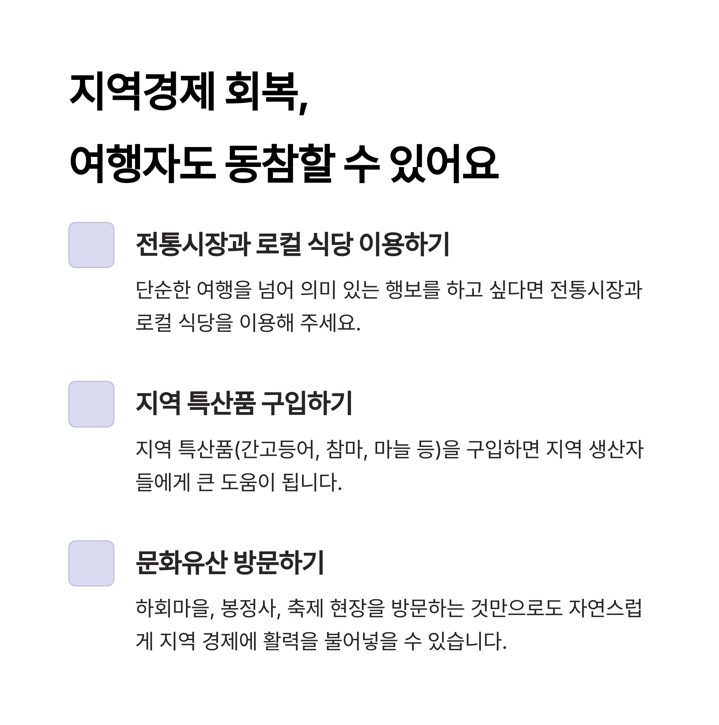 안동은 최근 산불로 큰 피해를 입은 지역 중 하나입니다. 하지만 여전히 따뜻한 정과 문화유산이 살아 숨 쉬는 여행지이기도 합니다. 지금 안동을 찾는 것은 단순한 여행을 넘어 지역 경제 회복에 직접적인 도움이 됩니다. 안동역을 거점으로 주요 관광지, 맛집, 숙소를 정리해 소개드립니다. 이번 여행은 지역 살리기에 동참하는 소중한 시간이 될 것입니다.