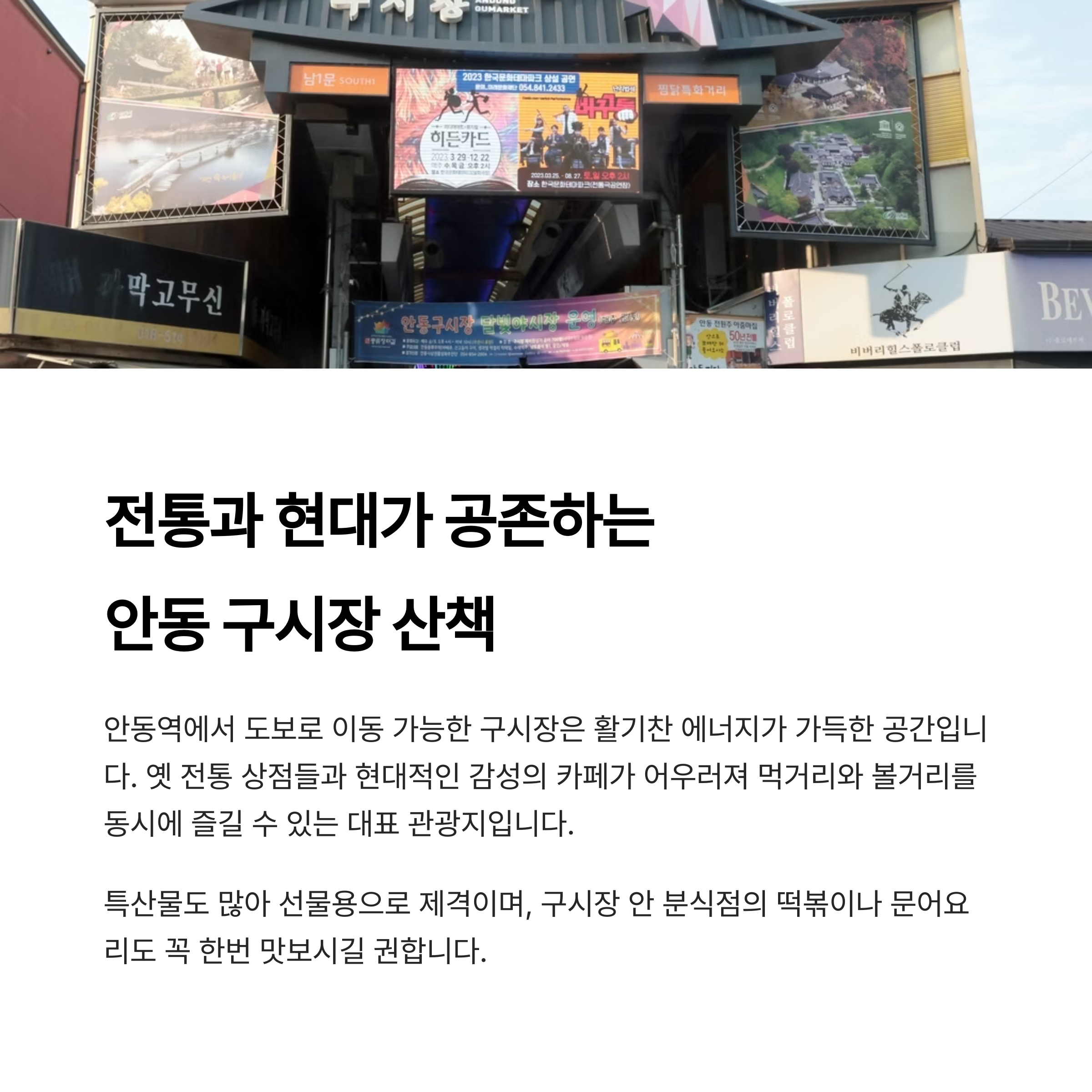 안동역에서 도보로 이동 가능한 구시장은 활기찬 에너지가 가득한 공간입니다.