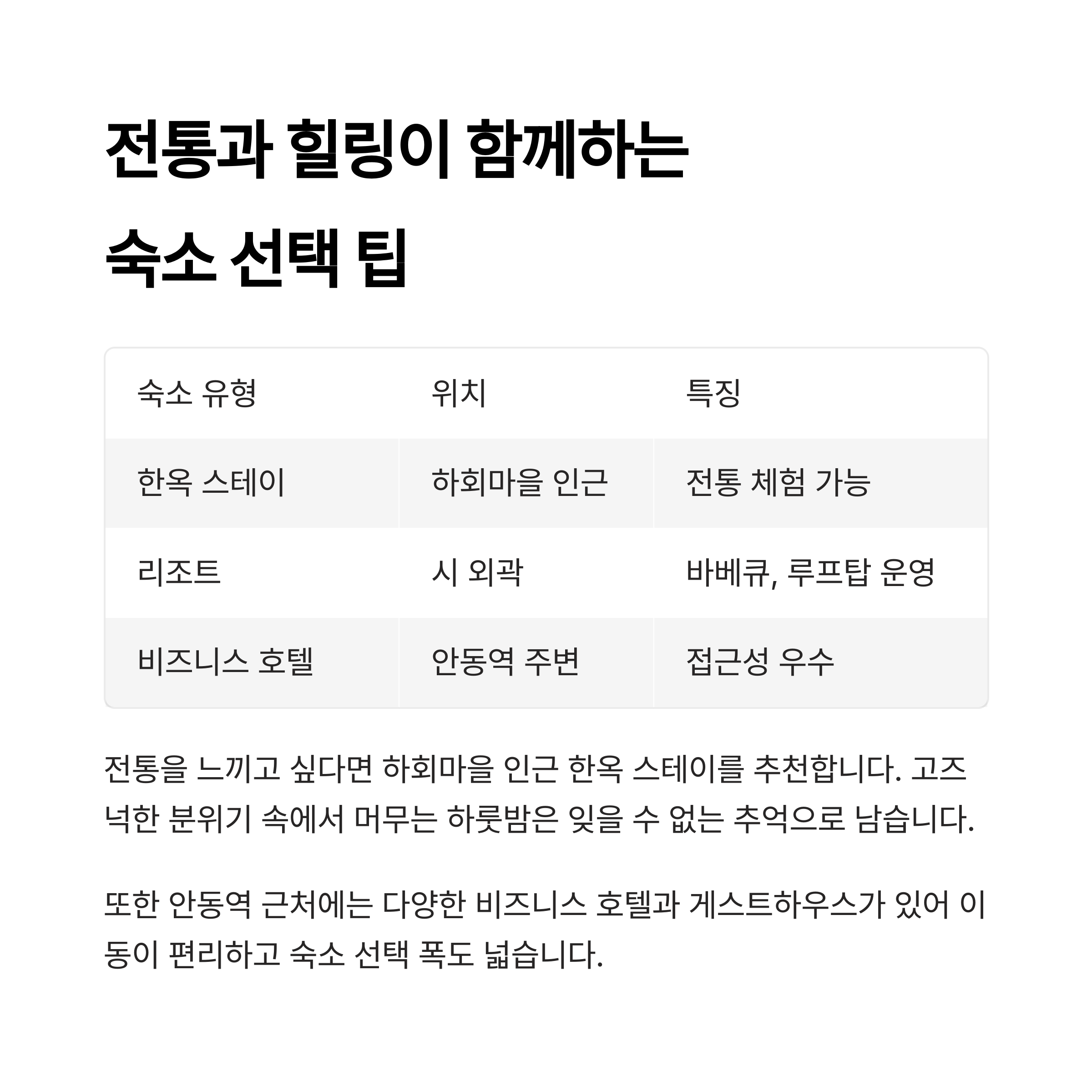 | 한옥 스테이 | 하회마을 인근 | 전통 체험 가능 |