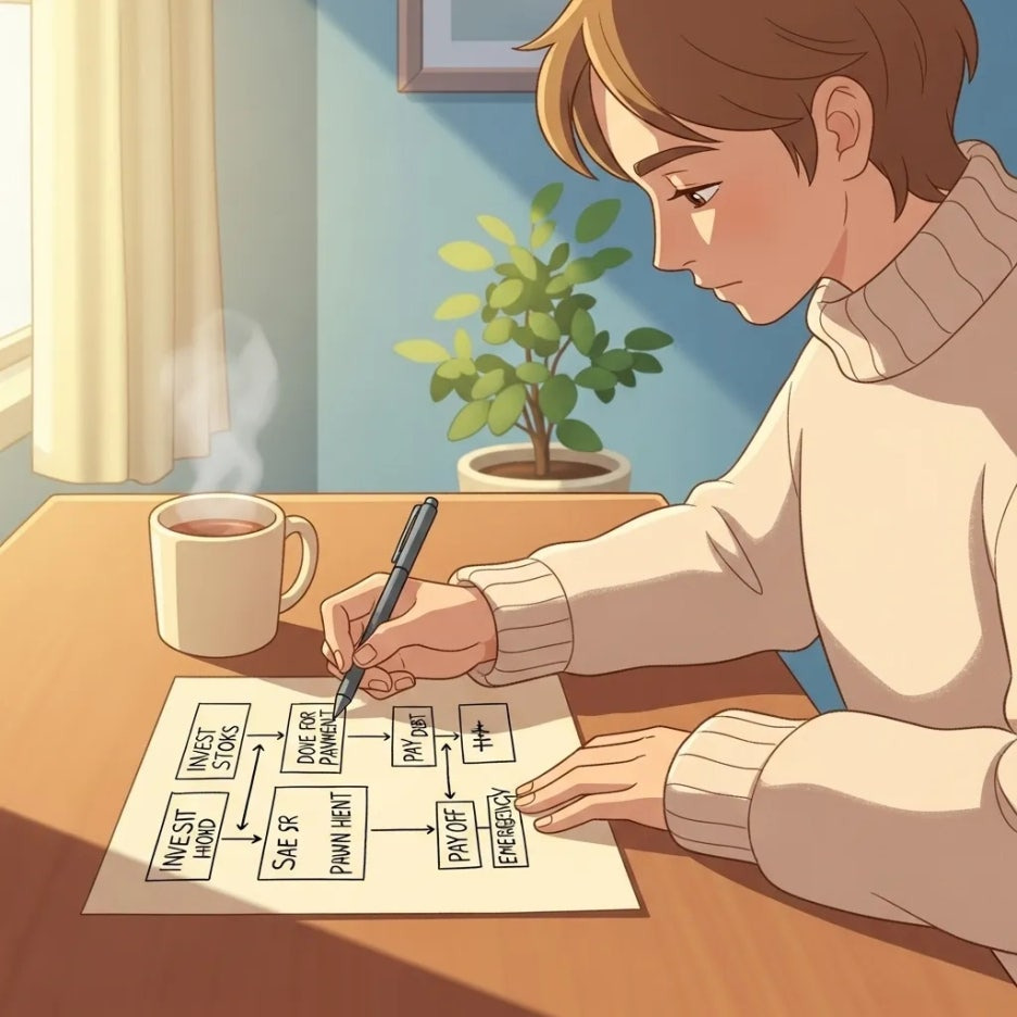 AI 활용 책상에서 금융 선택지를 신중하게 고민하는 사람