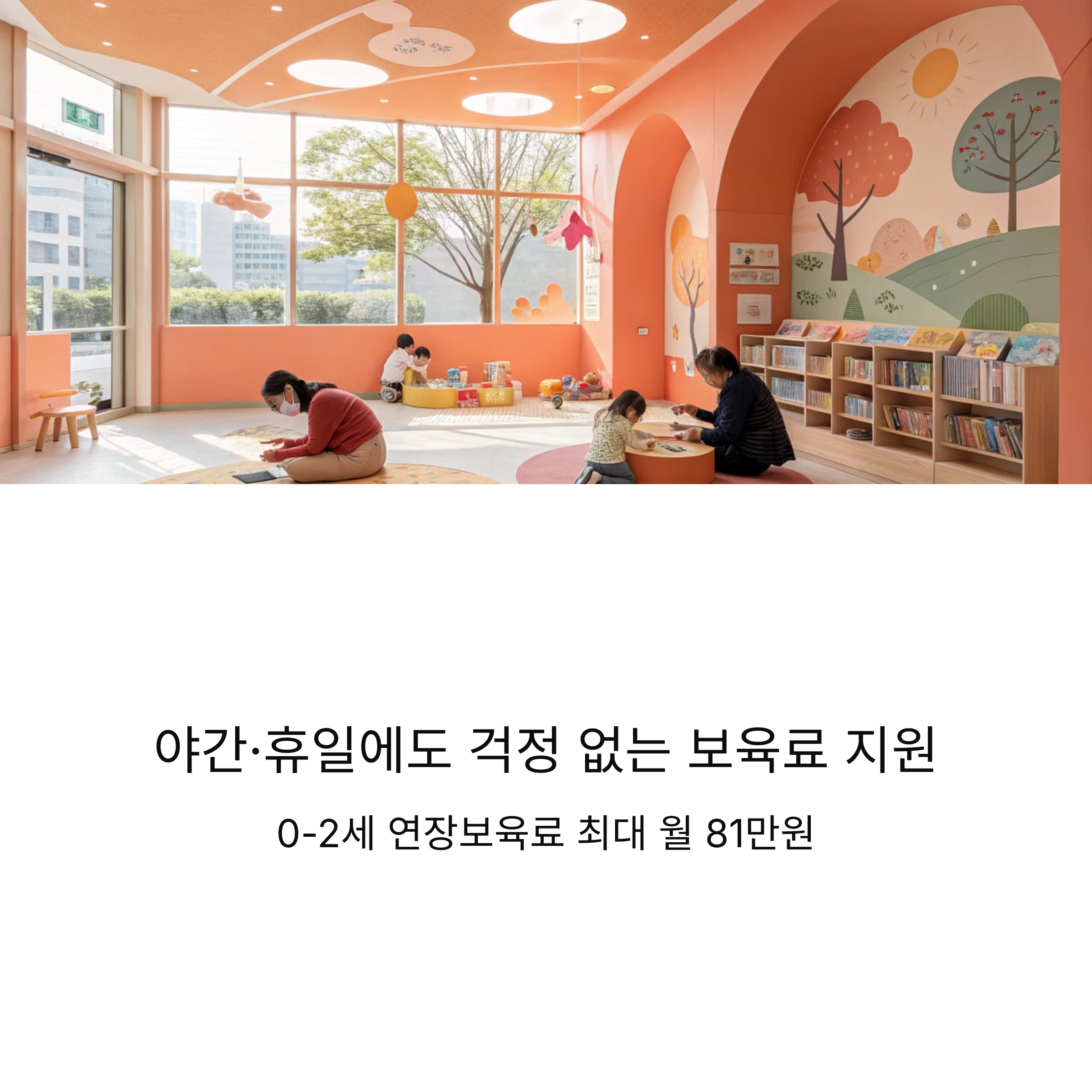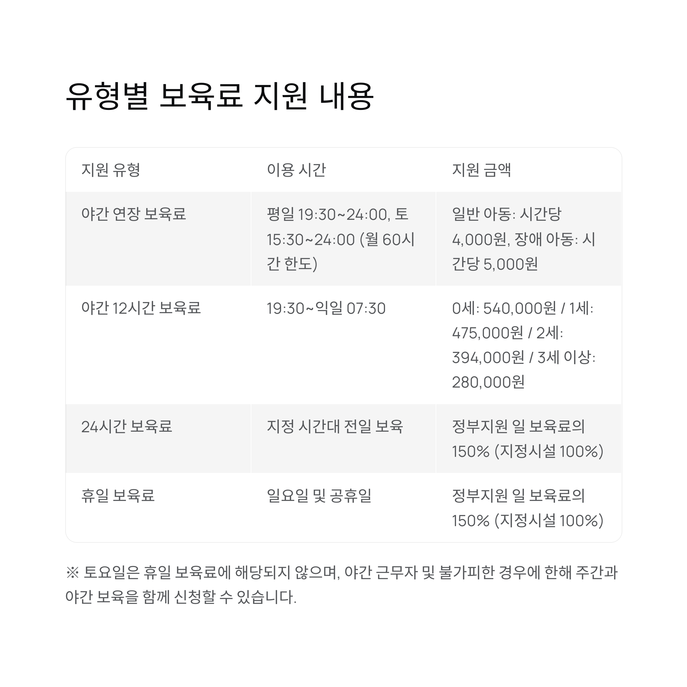 | 야간 연장 보육료 | 평일 19:30-24:00, 토요일 15:00-24:00 (월 60시간 한도) |