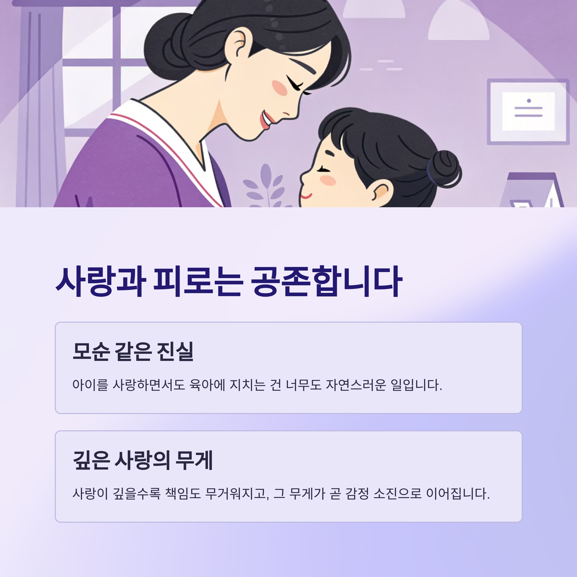아이를 사랑하면서도 육아에 지치는 건 너무도 자연스러운 일입니다.