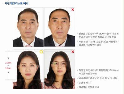 또한 안경테가 두껍거나 색이 짙은 렌즈는 사진 반려 사유가 될 수 있으므로 주의하세요.