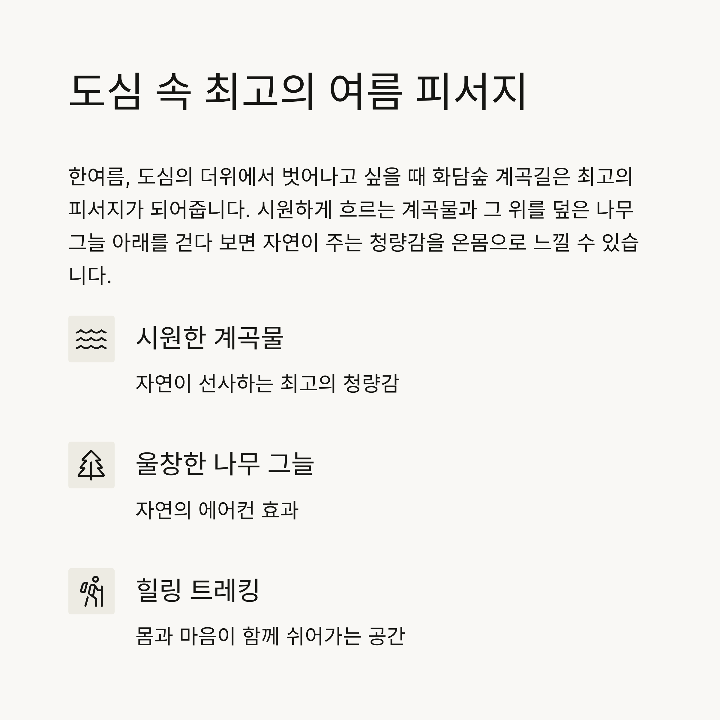 걷는 내내 시원한 물소리와 나무 그늘이 함께합니다.