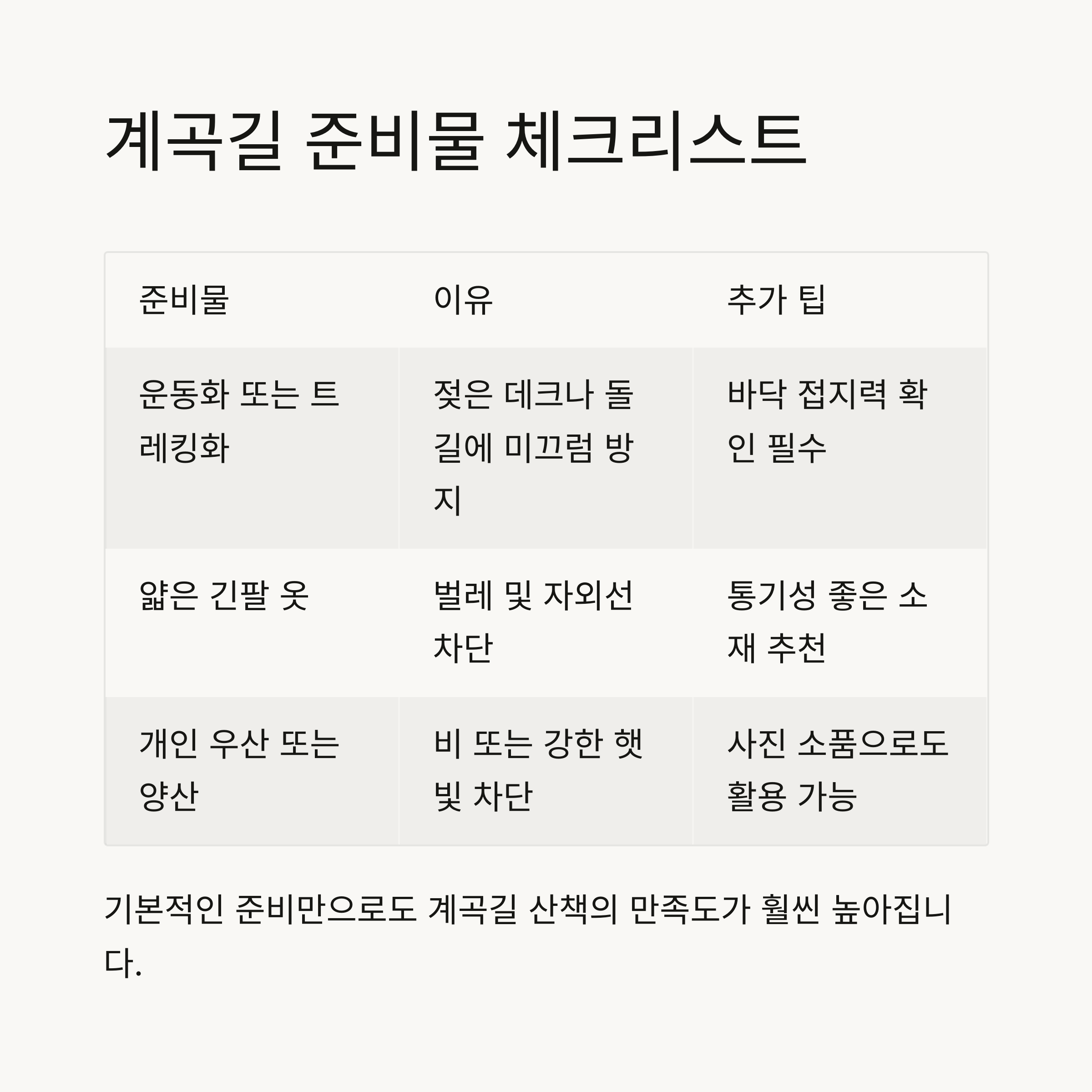 기본적인 준비만으로도 계곡길 산책의 만족도가 훨씬 높아집니다.