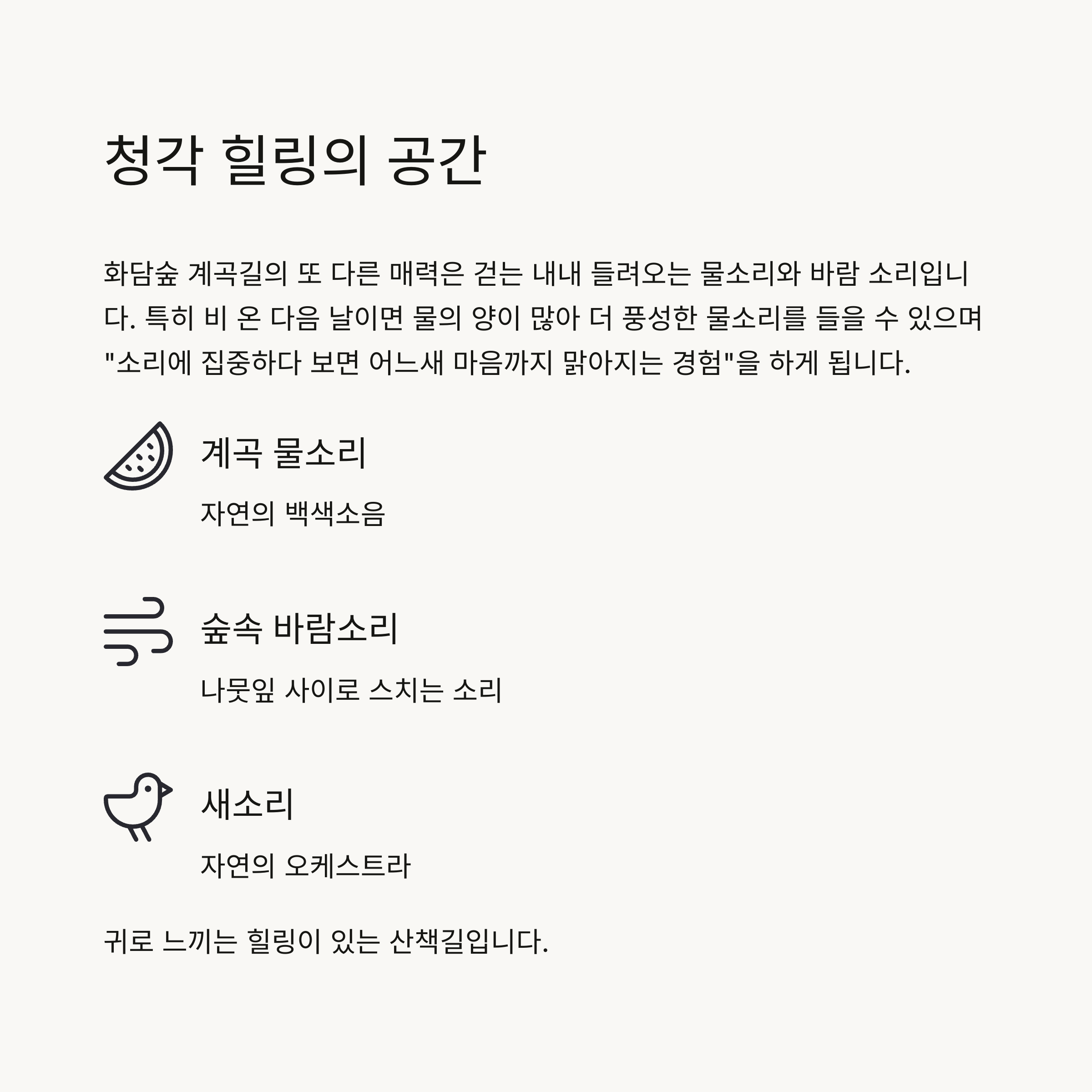 "소리에 집중하다 보면 어느새 마음까지 맑아지는 경험"을 하게 됩니다.