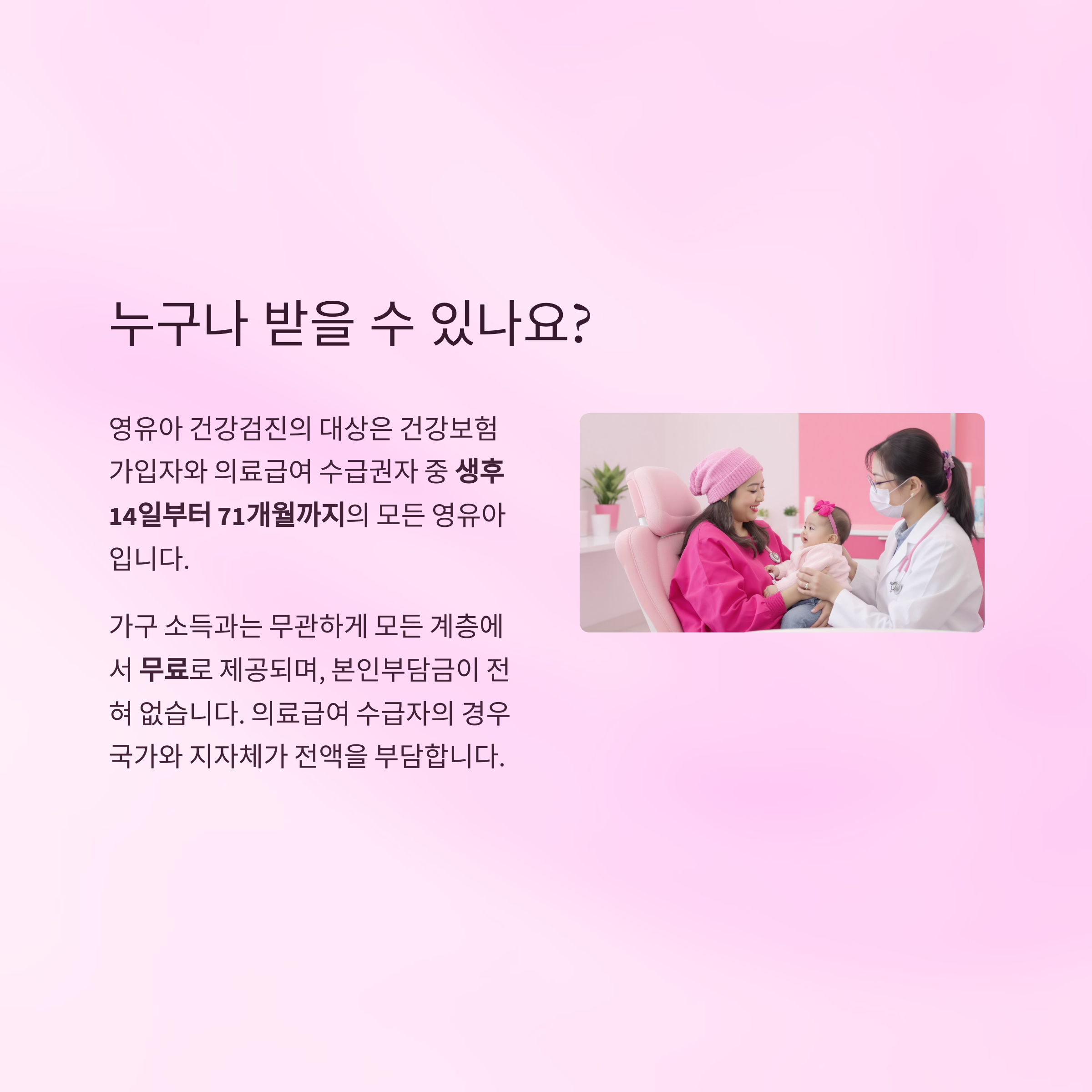영유아 건강검진의 대상은 건강보험 가입자와 의료급여 수급권자 중 생후 14일부터 71개월까지의 모든 영유아입니다.
