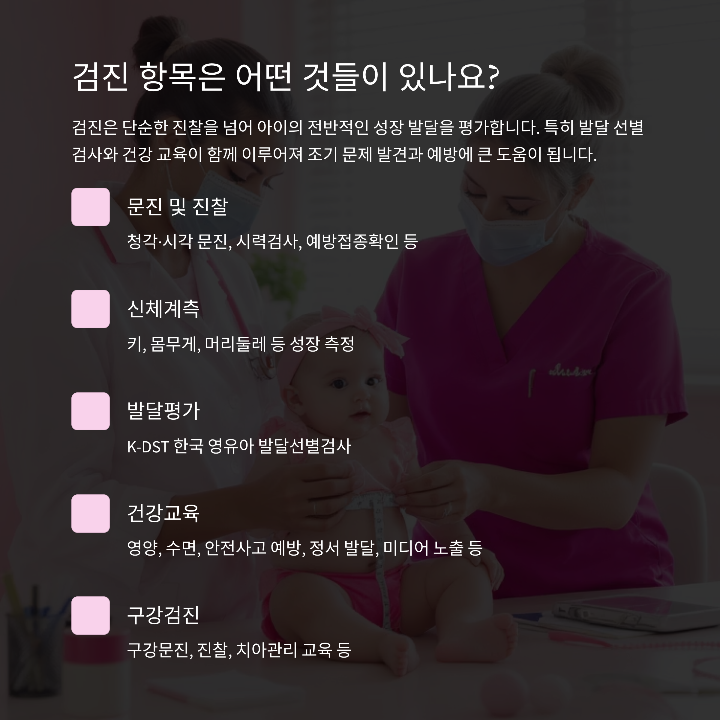 검진은 단순한 진찰을 넘어 아이의 전반적인 성장 발달을 평가합니다. 특히 발달 선별검사와 건강 교육이 함께 이루어져 조기 문제 발견과 예방에 큰 도움이 됩니다.
