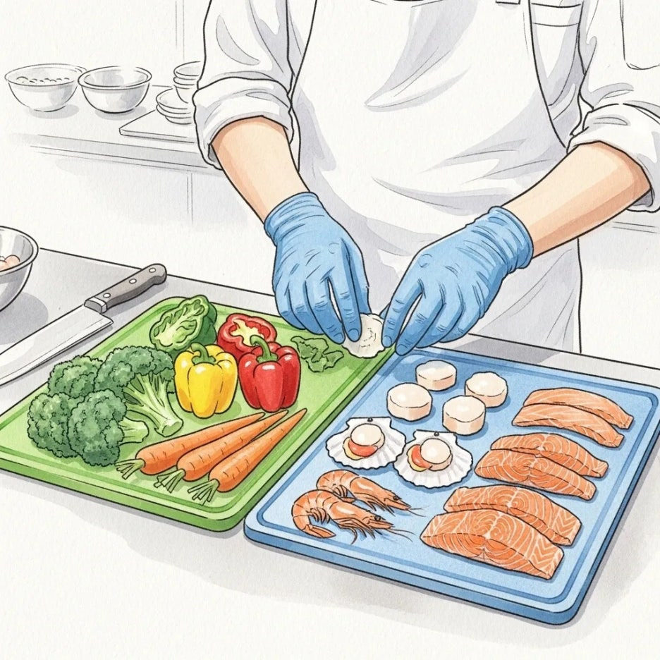 또한, 채소와 육류, 어류 등은 각각 다른 도마와 칼을 사용해서 교차 오염을 막아야 해요.