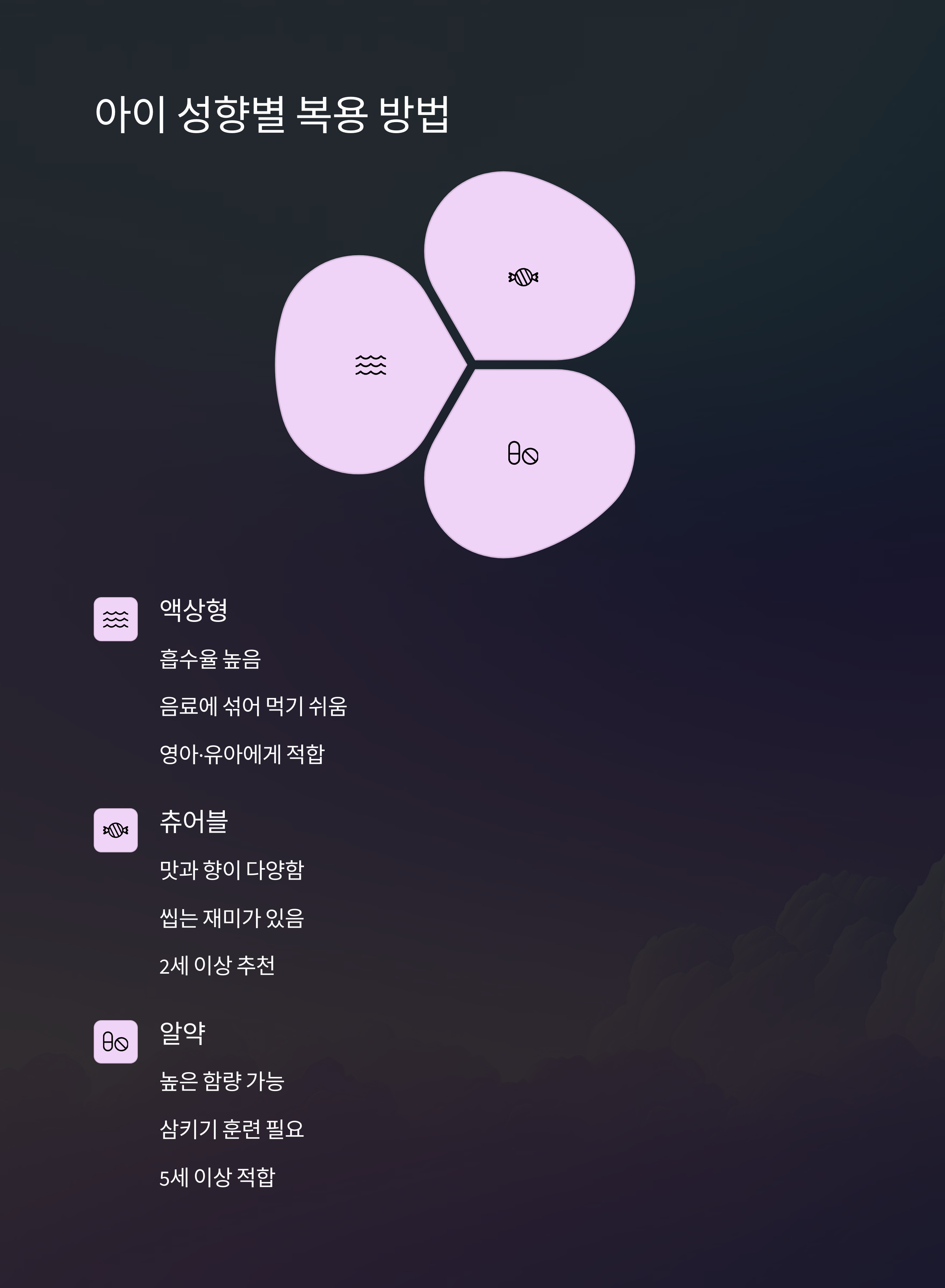 - 복용 편의성 (츄어블, 액상 등)