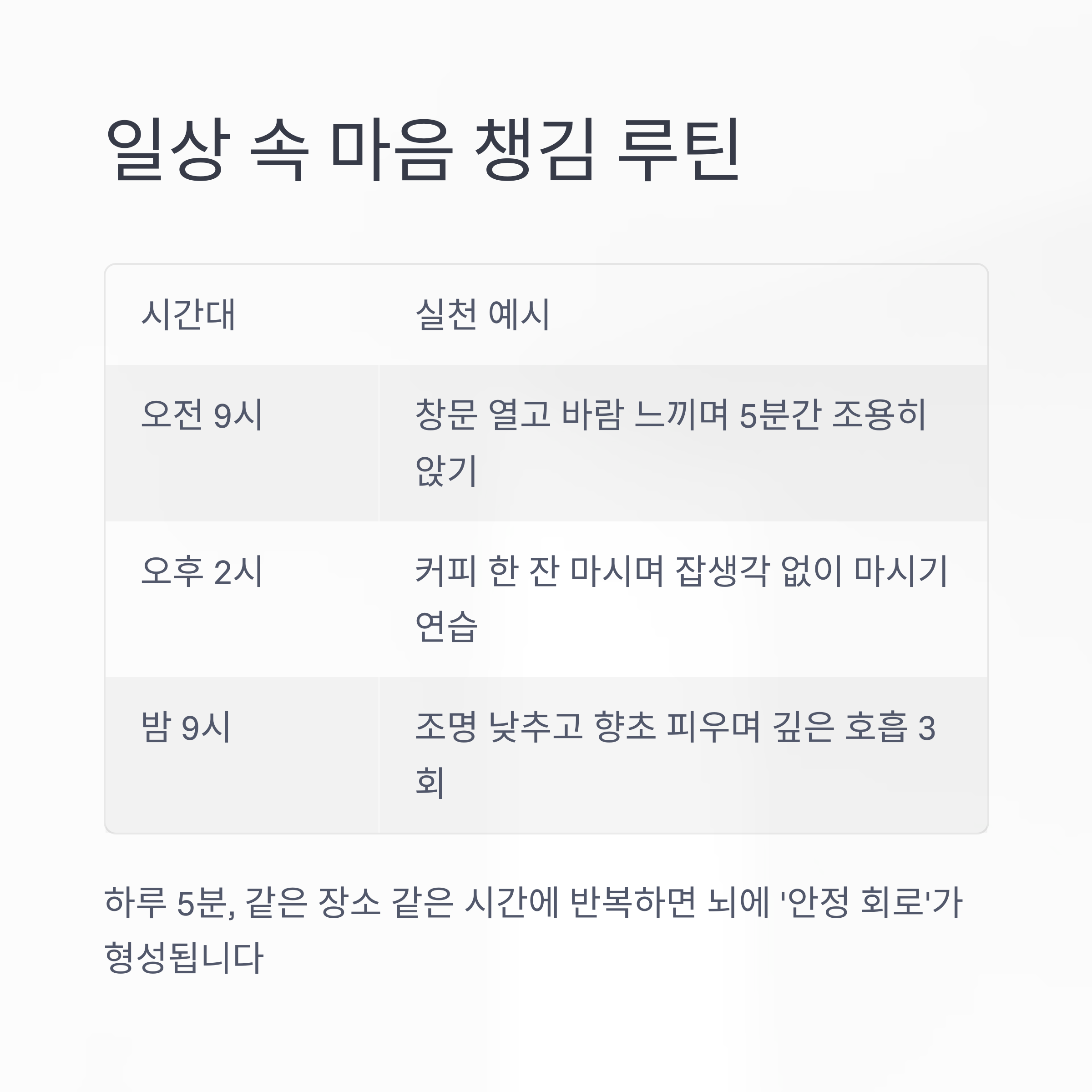 | 오전 9시 | 창문 열고 바람 느끼며 5분간 조용히 앉기 |