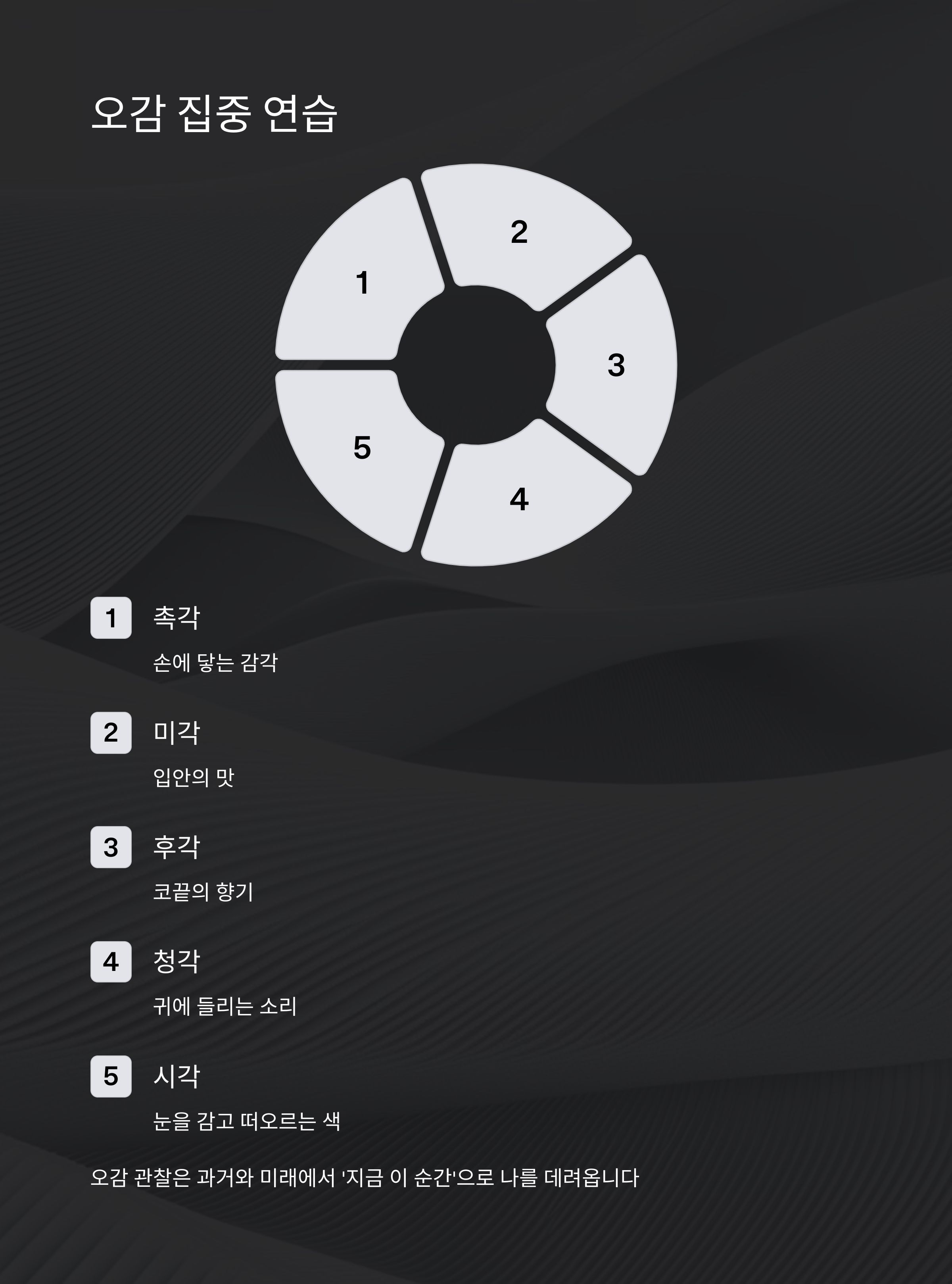 하루 한 번, 깊게 숨 들이마시고 천천히 내쉬는 5초간의 집중을 실천하세요.