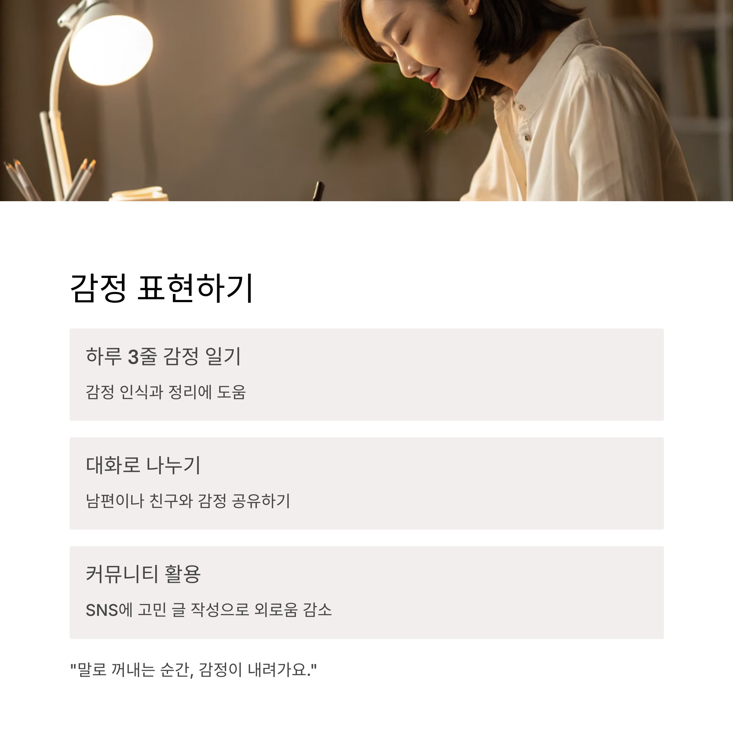 | 남편 또는 친구와 감정 대화 | 공감 + 해소 |