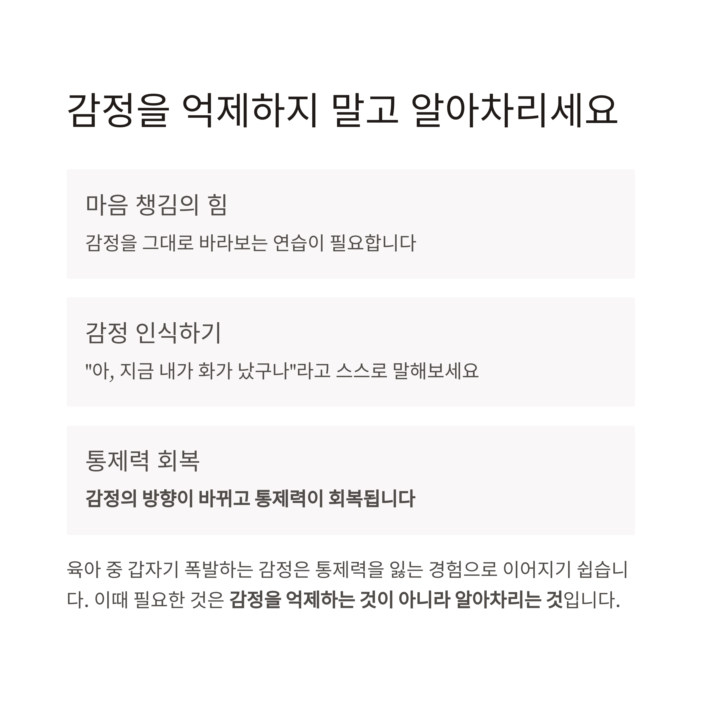 육아 중 갑자기 폭발하는 감정은 통제력을 잃는 경험으로 이어지기 쉽습니다.