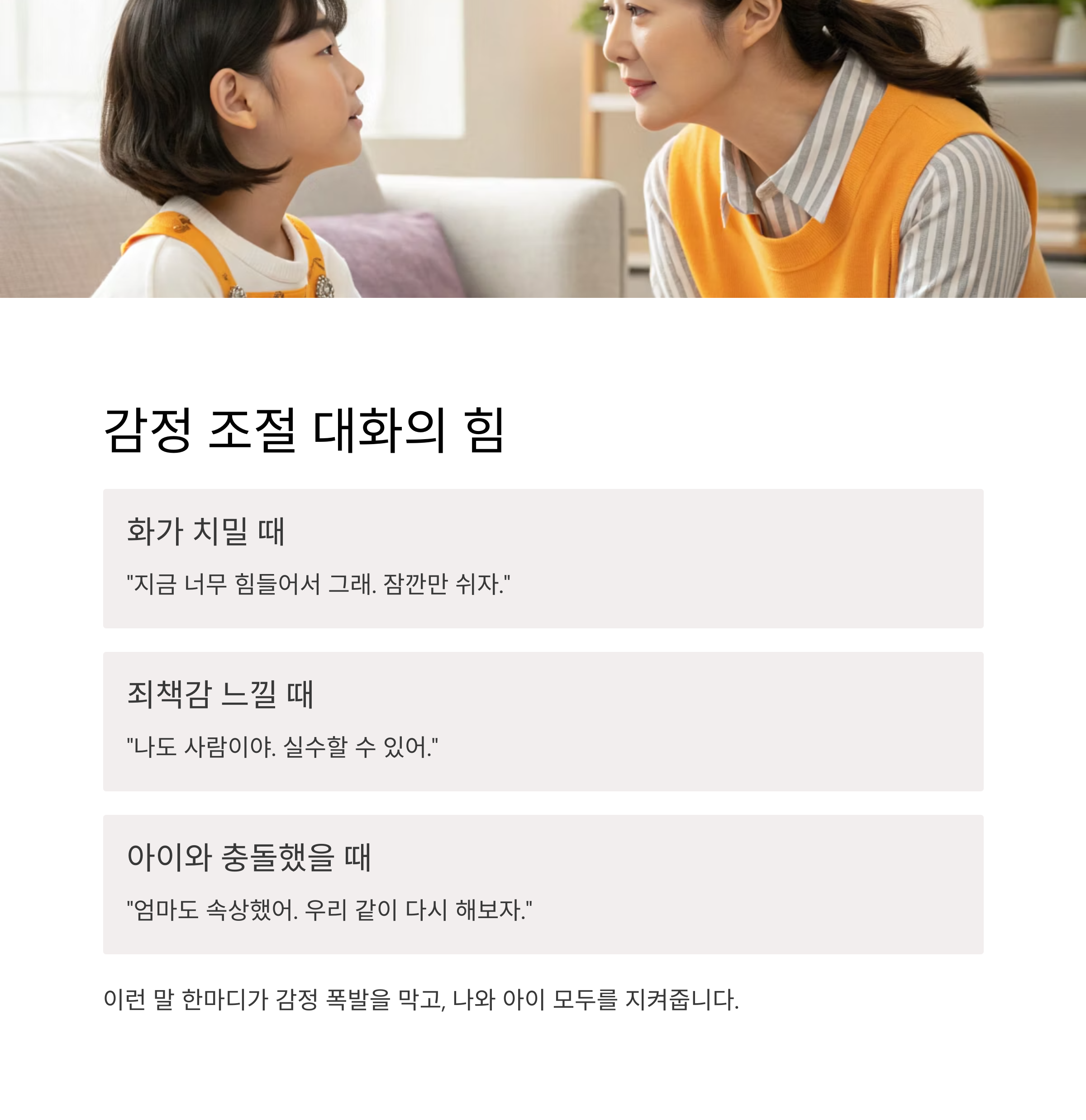 | 아이와 충돌했을 때 | “엄마도 속상했어. 우리 같이 다시 해보자.” |