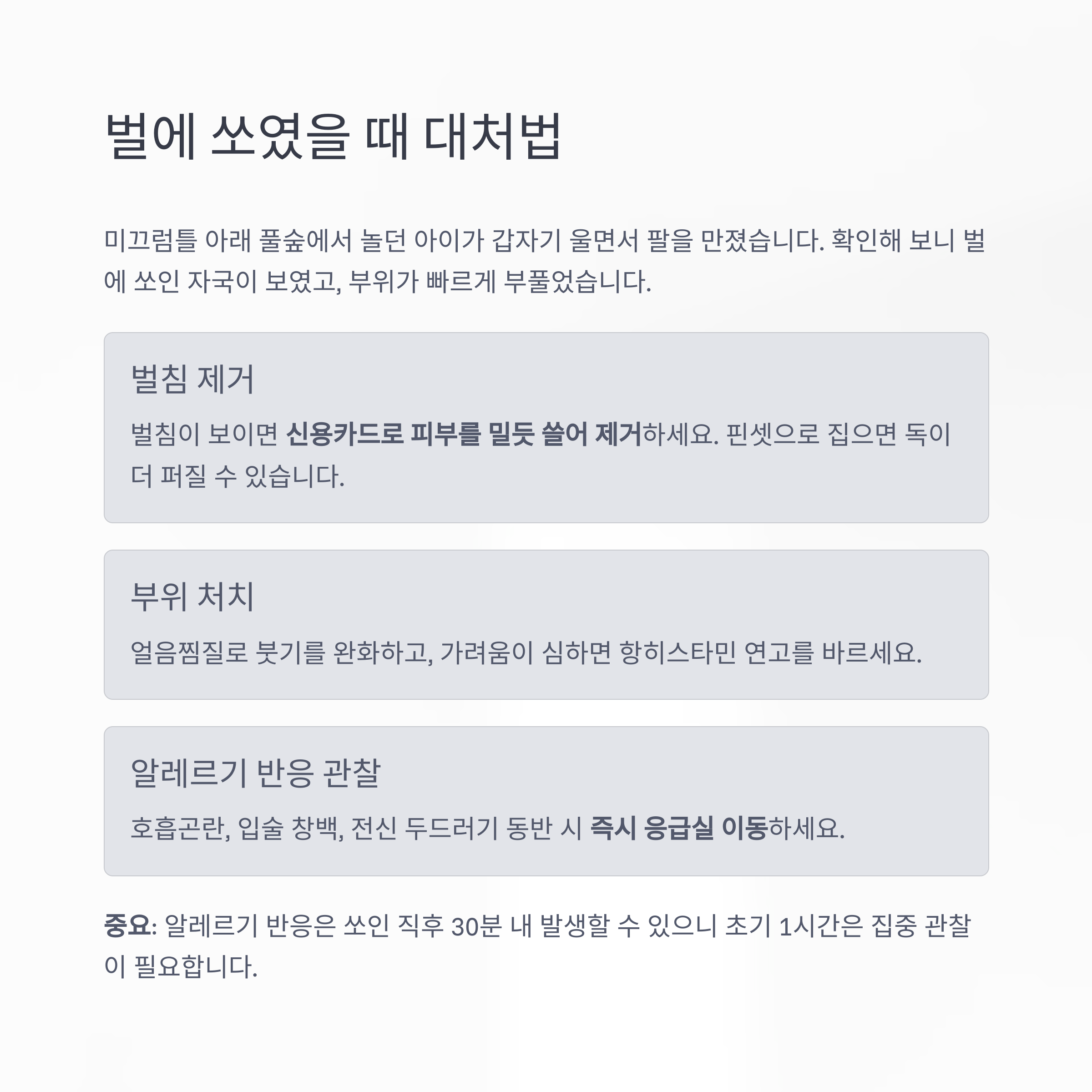 중요: 알레르기 반응은 쏘인 직후 30분 내 발생할 수 있으니