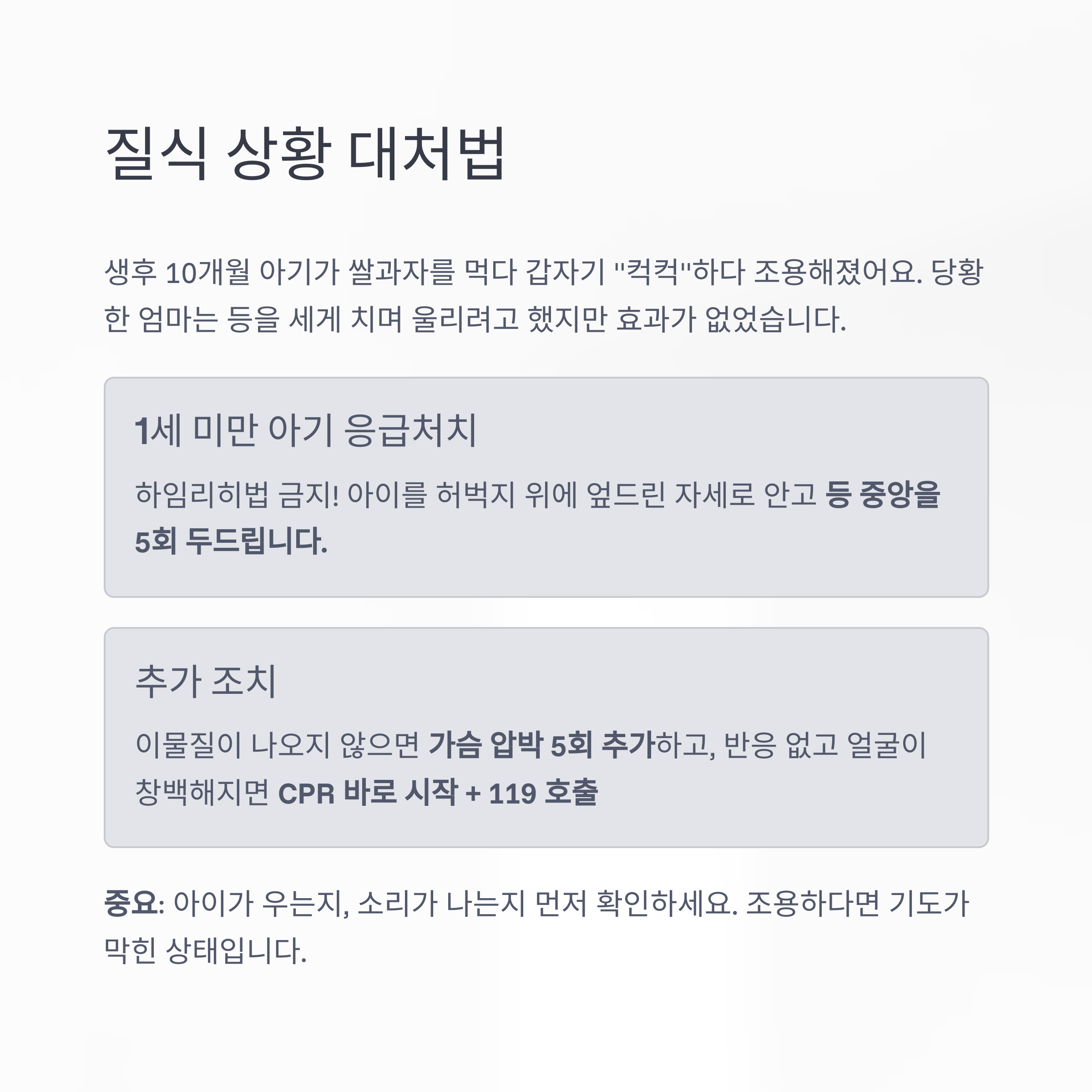 상황: 생후 10개월 아기가 쌀과자를 먹다 갑자기 "컥컥"하다 조용해졌어요.