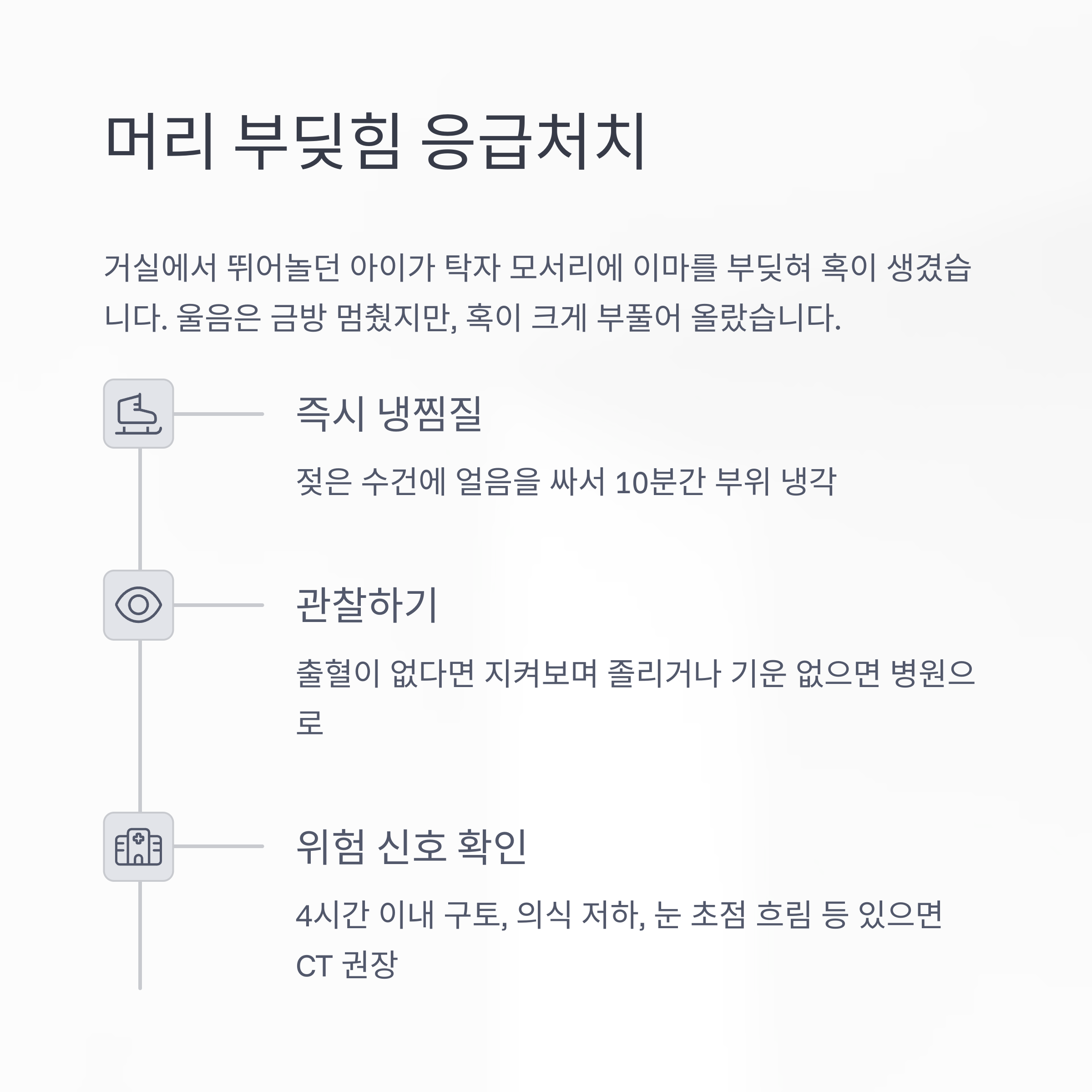 상황: 거실에서 뛰어놀던 아이가 탁자 모서리에 이마를 부딪혀 혹이 생겼습니다.
